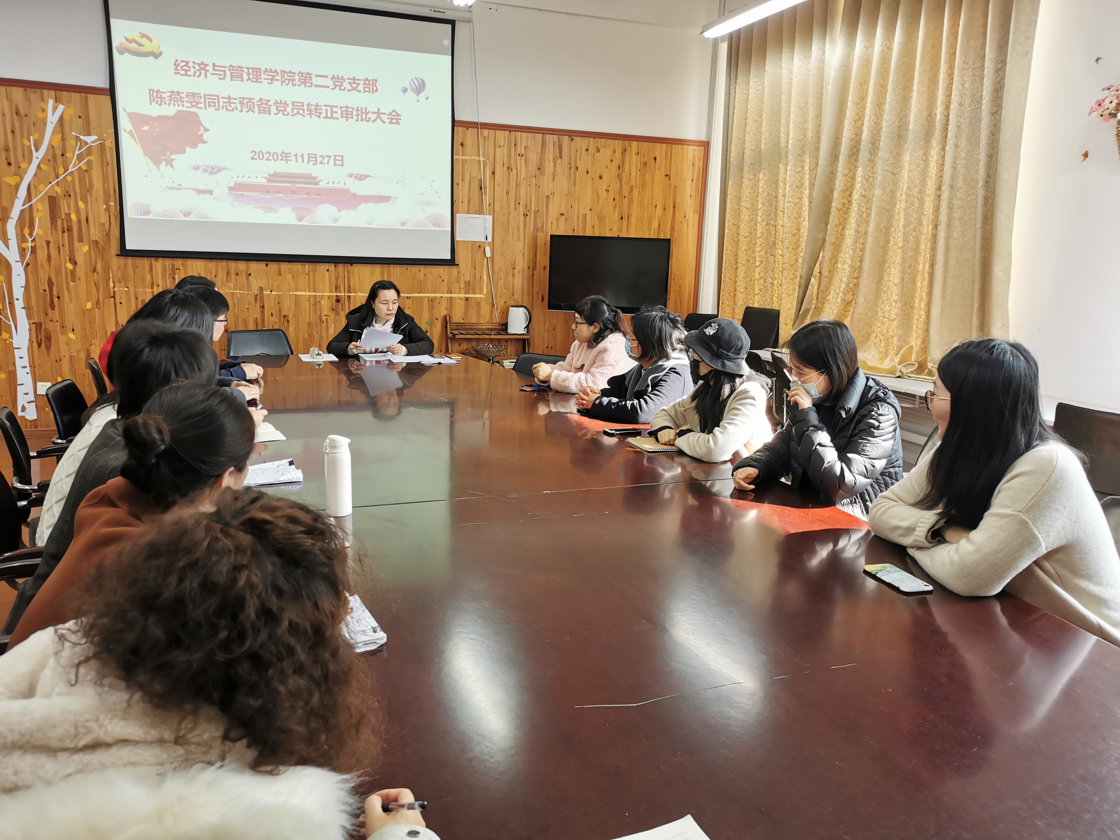 2020年11月27日经济与管理学院第二党支部召开陈燕雯同志预备党员转正审批大会,会议由经济与管理学院党总支副书记杨慧同志主持,杨慧同志先向在座党员教师介绍陈燕雯同志的基本情况,陈燕雯同志是经济与管理学院教学秘书,工作认真、思想端正、生活上时刻以党员的标准要求自己。
