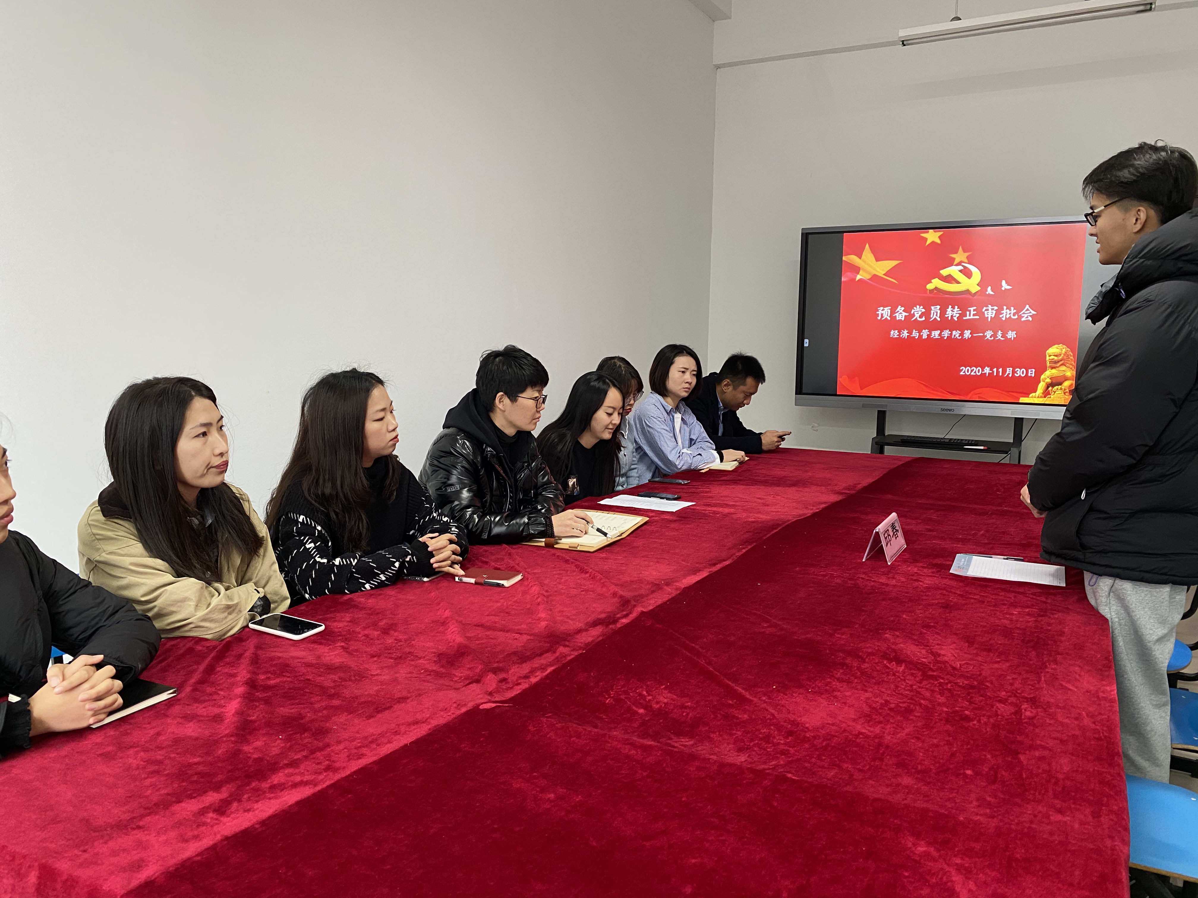 2020年11月30日下午,经济与管理学院第一党支部在4#203召开了预备党员转正大会,讨论郝玉娇同志、邱春同志和姚婧同志的转正事宜。会议由邵静老师主持,我支部共有党员30名,其中有表决权的正式党员11人,出席会议有表决权的党员11人,超过本支部有表决权党员半数,符合规定人数,可以开会。