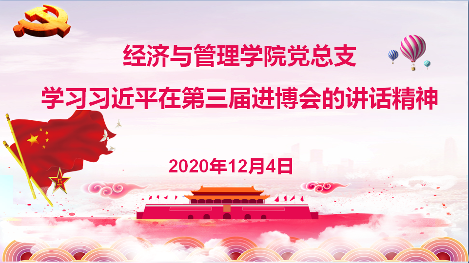 为深入学习和领会习近平重要讲话精神,2020年12月4日12:00,经济与管理学院教师党员在3-313集中学习习近平在第三届进博会的讲话精神,所有教师党员参加会议,会议由党总支副书记杨慧老师主持。