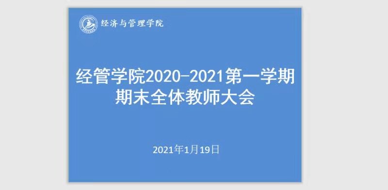 2021年1月19日晚8点,经济与管理学院在腾讯会议召开2020-2021第一学期期末全体教师大会,学院院长张炳达教授、教学副院长王殿安教授、范海燕教授、党总支副书记杨慧老师和郭骏老师以及各专业主任、院长助理、任课教师和辅导员老师、行政人员共同参与了会议。会议由张炳达院长主持。