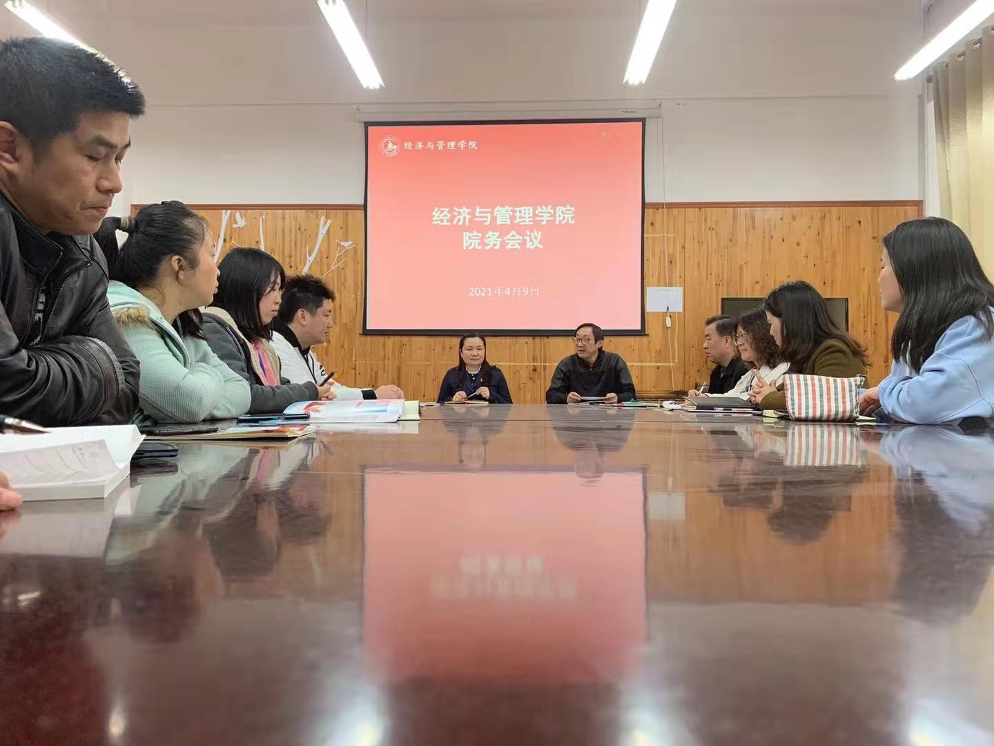 4月9日下午,经济与管理学院在3号楼313会议室召开院务工作会议,会议由张院长主持,副院长王殿安教授、党总支副书记杨慧老师、郭骏老师、院长助理李娟老师、专业主任和教学秘书参会。