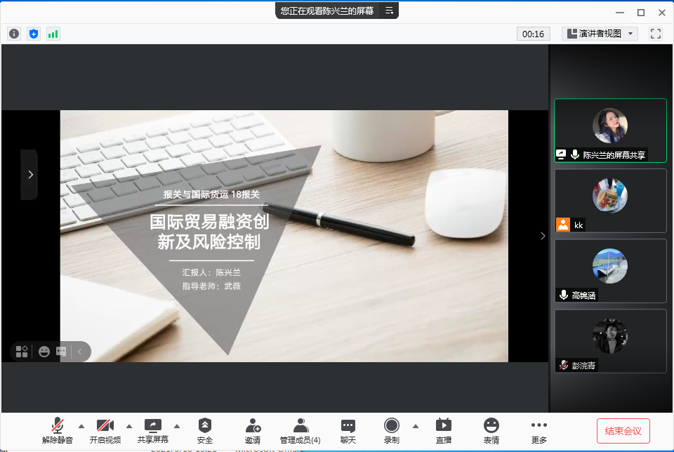 考虑到对学生的便利和疫情防控的要求,本次答辩采用线上答辩进行。答辩学生按时依次在线上等候准备,然后按次序进入答辩会议室进行论文答辩。毕业生先对自己毕业论文的研究内容进行自述,然后回答答辩组老师提出的有关问题。