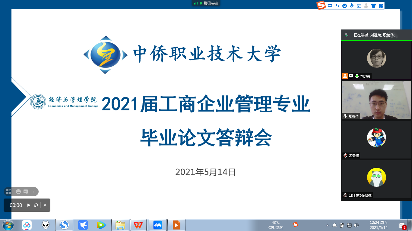 5月14日下午,工商管理专业2021届毕业论文答辩工作在腾讯会议平台顺利举行。负责此次论文答辩工作的有工商专业专任教师刘继荣、高峰、钱方圆、耿昊裔老师以及2021届毕业班辅导员王沈、孟天翔老师。2021届毕业班近80名学生参加了论文答辩。