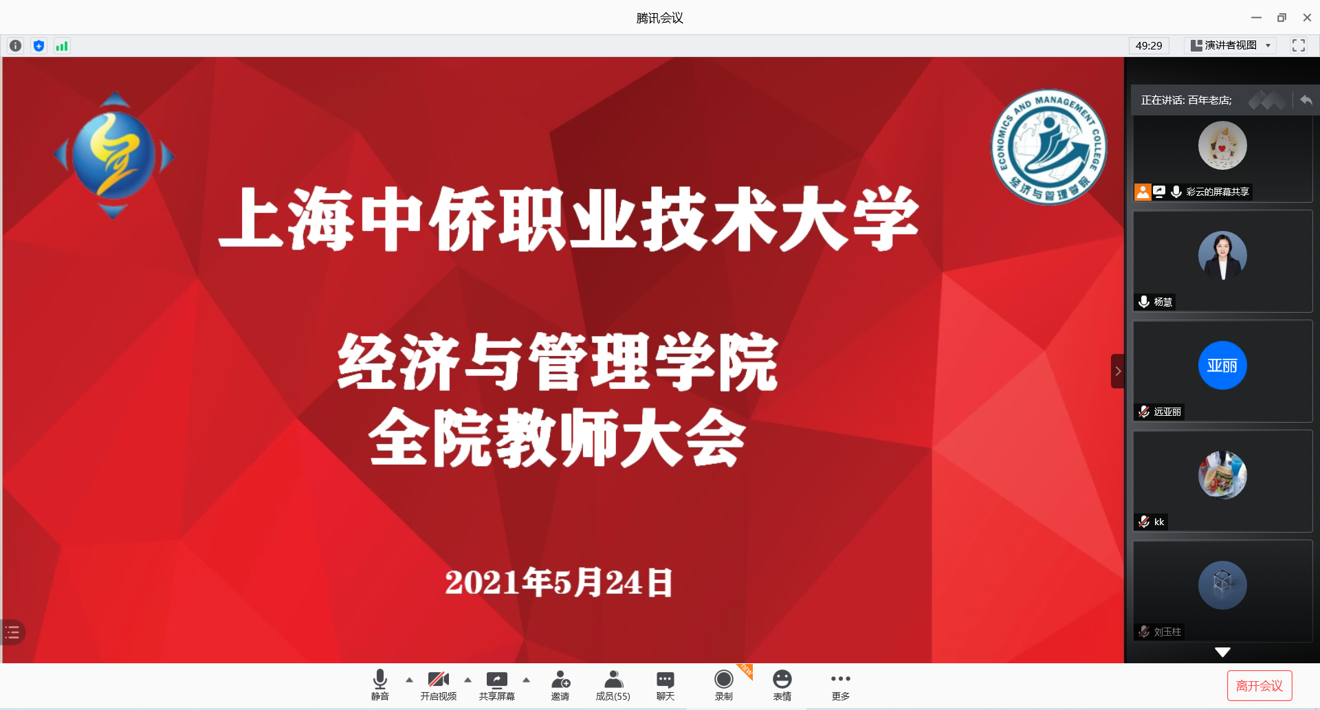 2021年5月24日晚20:00,经济与管理学院利用腾讯会议召开线上全院大会,张院长、王殿安和范海燕副院长、杨慧和郭骏副书记,以及学院全体教职员工共同参会,会议由办公室主任王彩云老师主持。