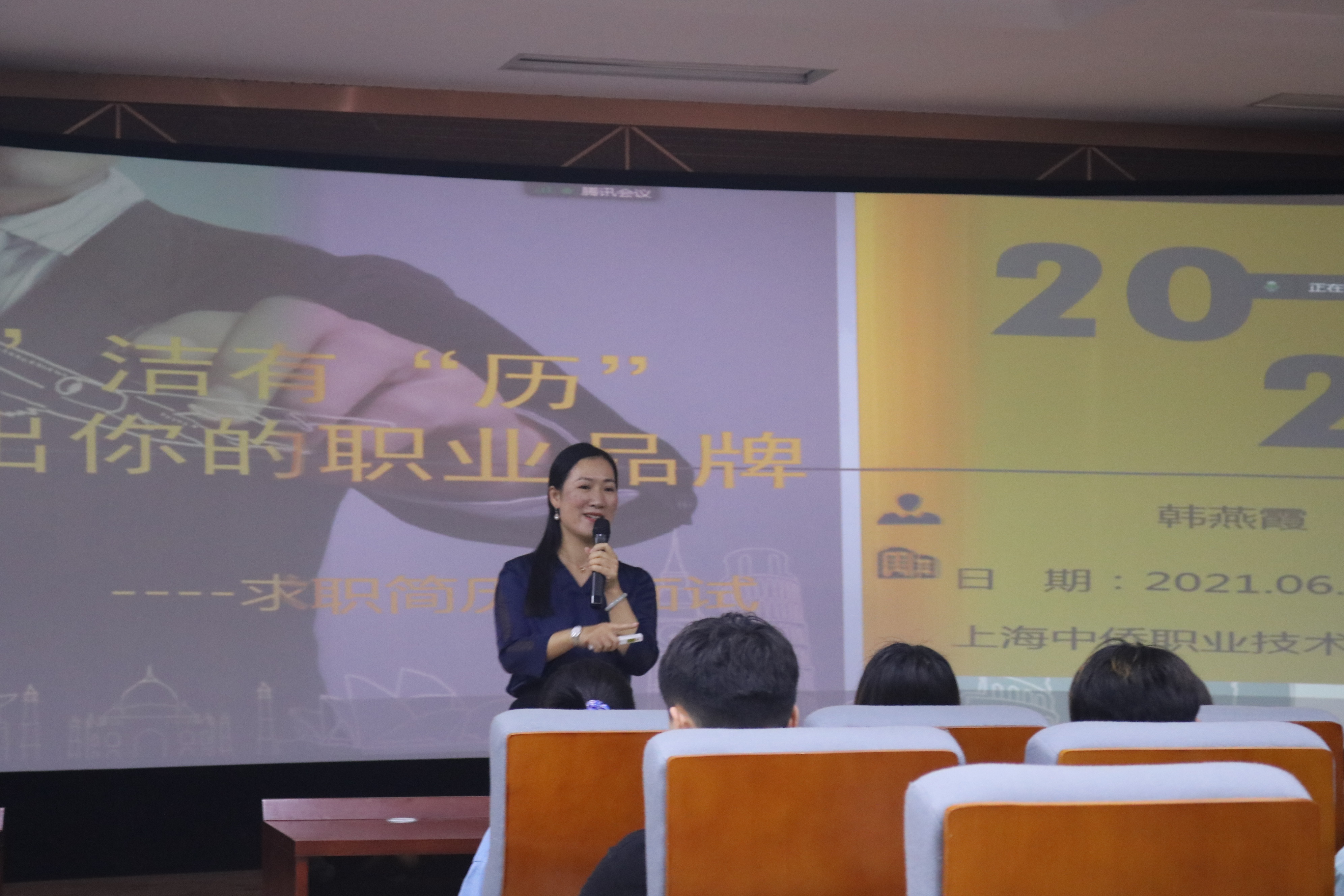 特邀嘉宾韩燕霞副教授,全球生涯规划师(GCDF)、全国生涯规划专家(北森公司实战专家库成员)、国家认证生涯规划师、全球生涯教练(BCC)、福州职业技术学院副教授,主讲题为“‘简’洁有‘历’——亮出你的职业品牌”。讲座伊始,韩教授结合《2021年大学生就业力调研报告》,向学生具体讲述了职业世界与求职形式,使大家初步了解职业教育春天来临,在感知机遇的同时,又具有就业形势严峻的危机意识。