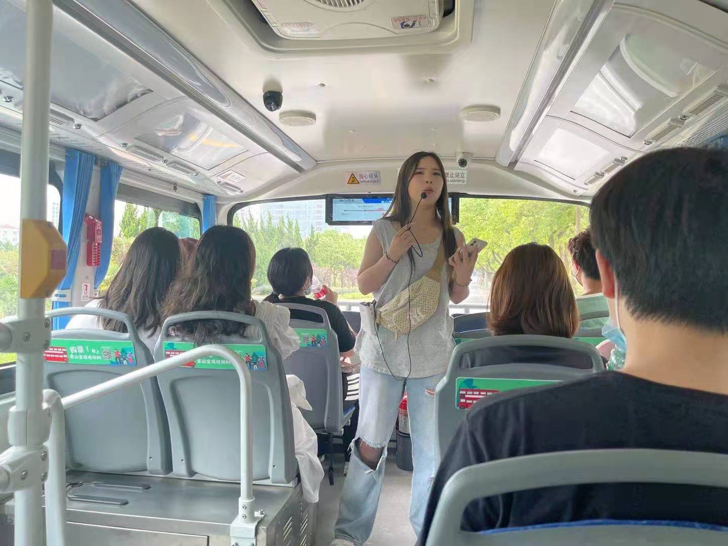 在城市沙滩景区,同学们仔细聆听专业导游的讲解,认真对比自己出发前所掌握的相关材料,并及时做好笔记,为后期调研报告的撰写积累素材。在返程中,各小组进行景区和沿途导游讲解训练,同学们声情并茂的讲解,既体现了良好的专业素养,也展现了对旅游行业的热爱。景区专业导游陆先生和校内专职教师,对同学们的讲解,都给予了充分肯定,同时提出了改进建议,校内外“双导师”同步现场指导的新颖实训方式,受到同学们的热烈欢迎和积极反馈。
