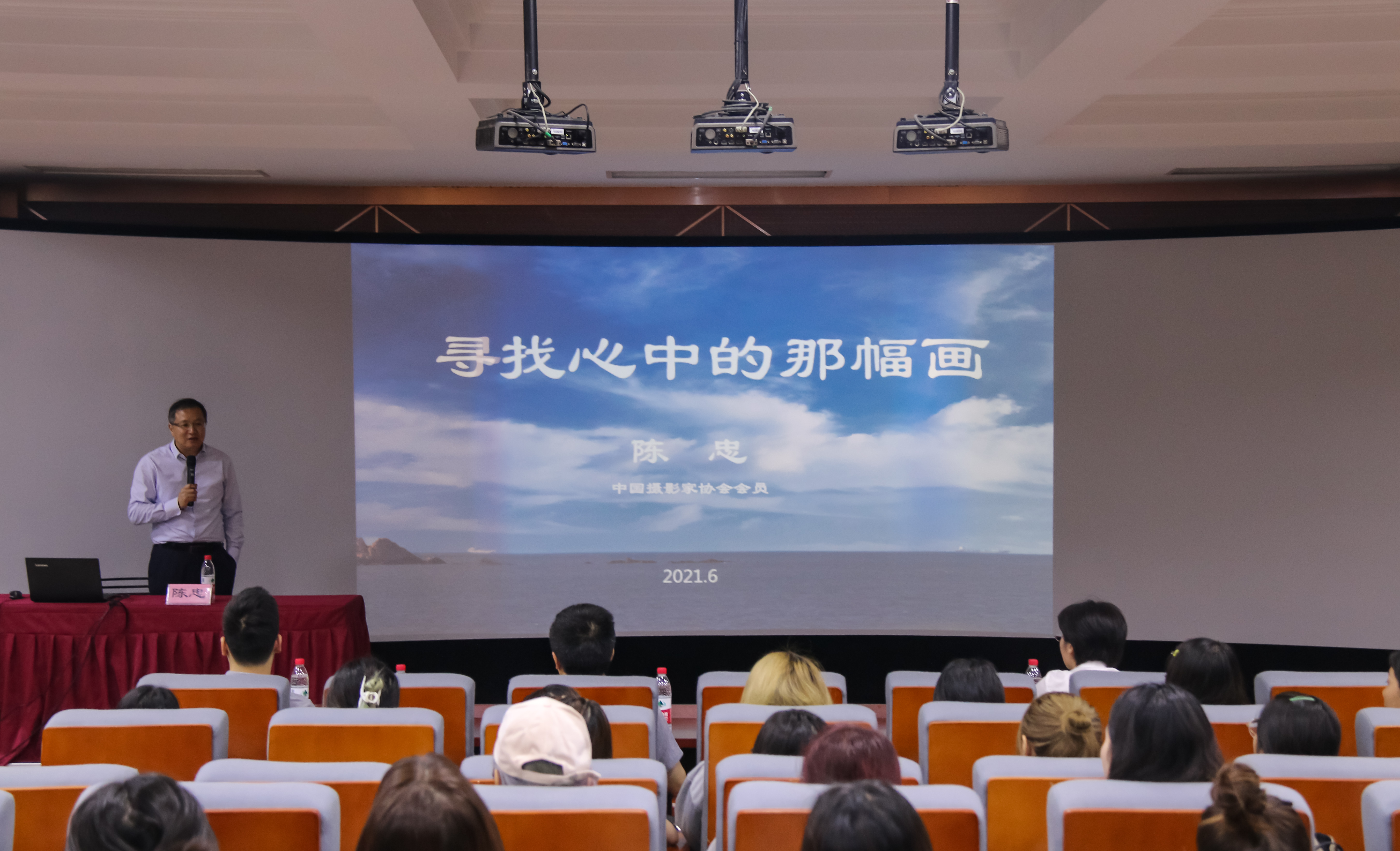 为了夯实学生专业实践技能,提升学生审美能力,通过摄影展现祖国的大好河山,2021年6月24日,金山区文化和旅游局副局长、中国摄影家协会会员陈忠老师应金山区职教集团项目组老师邀请,来到上海中侨职业技术大学经济与管理学院,走进6号楼306大礼堂,为旅游与工商专业学生,开展了一场以《寻找心中的那幅画》为主题的摄影艺术讲座。金山区文化和旅游局三位老师及学校科研处侯雨豪处长、经济与管理学院教师滕建华、李娟、陈灵萍参与讲座。本次讲座分为三个环节,一是作品分享,二是现场点评,三是图中人生。
