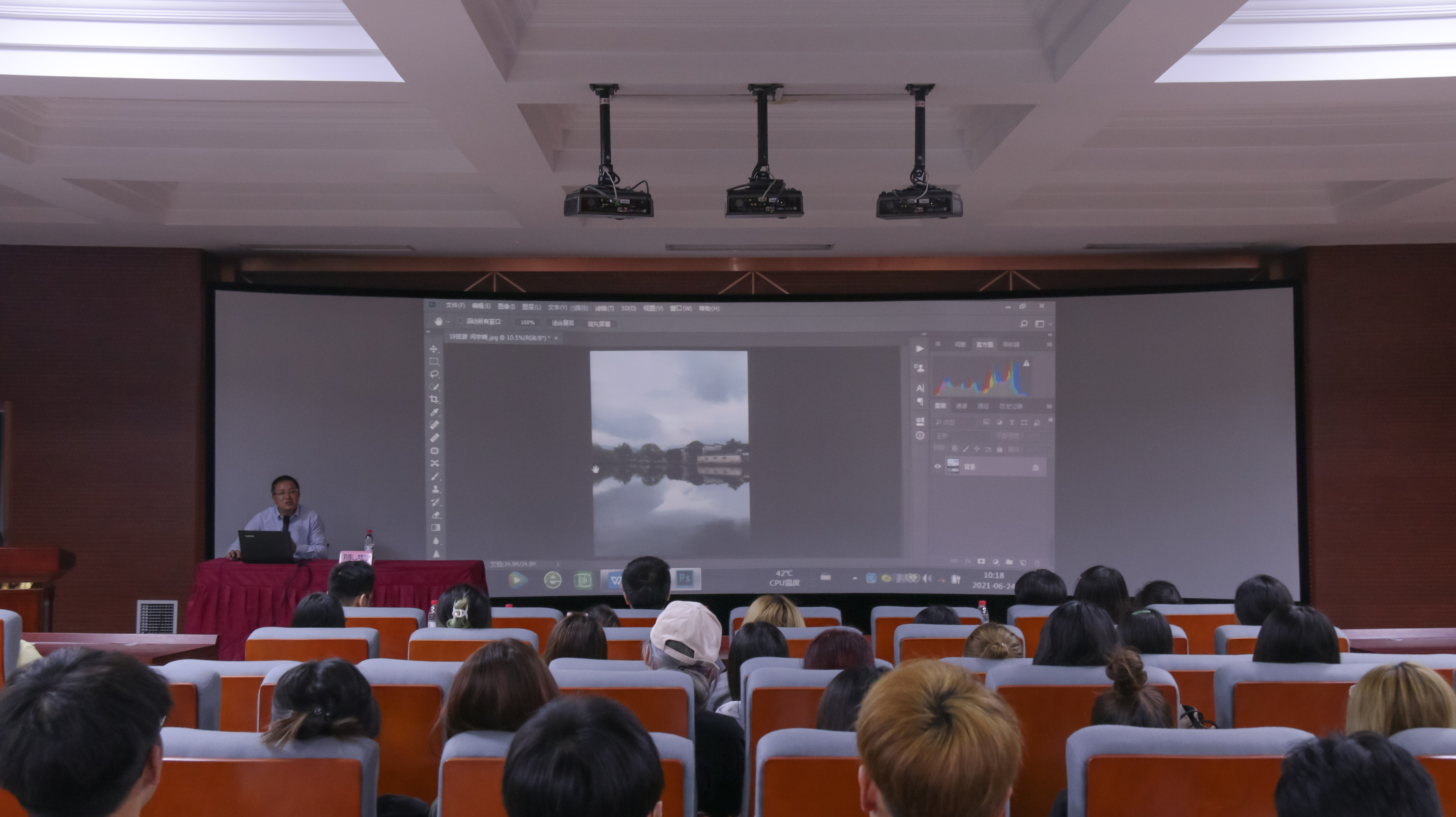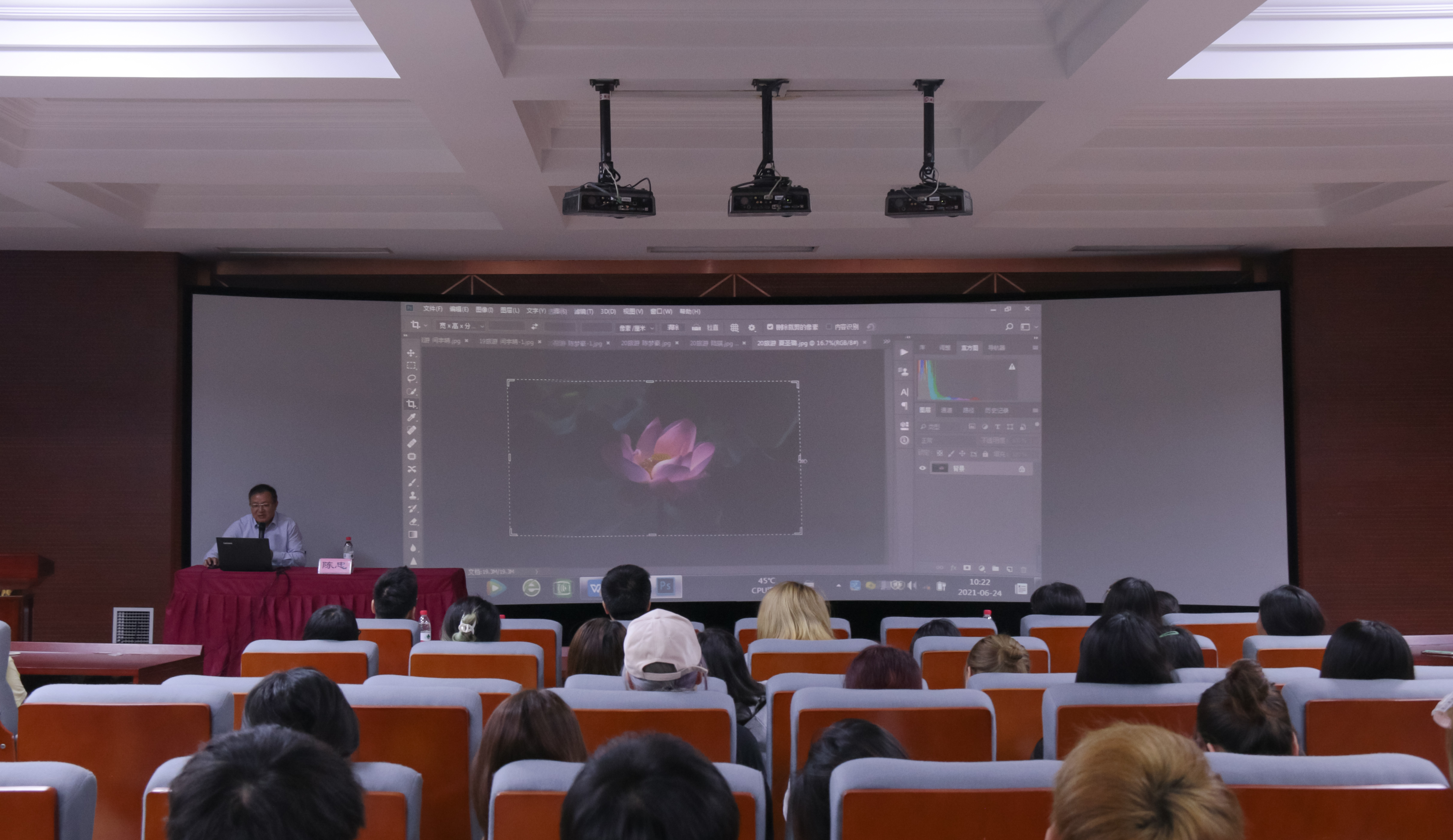陈老师提前收集了我们部分学生和老师的作品,对每张照片都认真分析并提出个人修改意见,现场用Photoshop修图,再将原照片和修改后的照片进行对比,同学们观看整个过程后恍然大悟,通过分享,大家了解到摄影时如何选景、如何构图、如何等待最佳拍摄时间及拍摄完成后如何修图,从而使得照片更加完美。