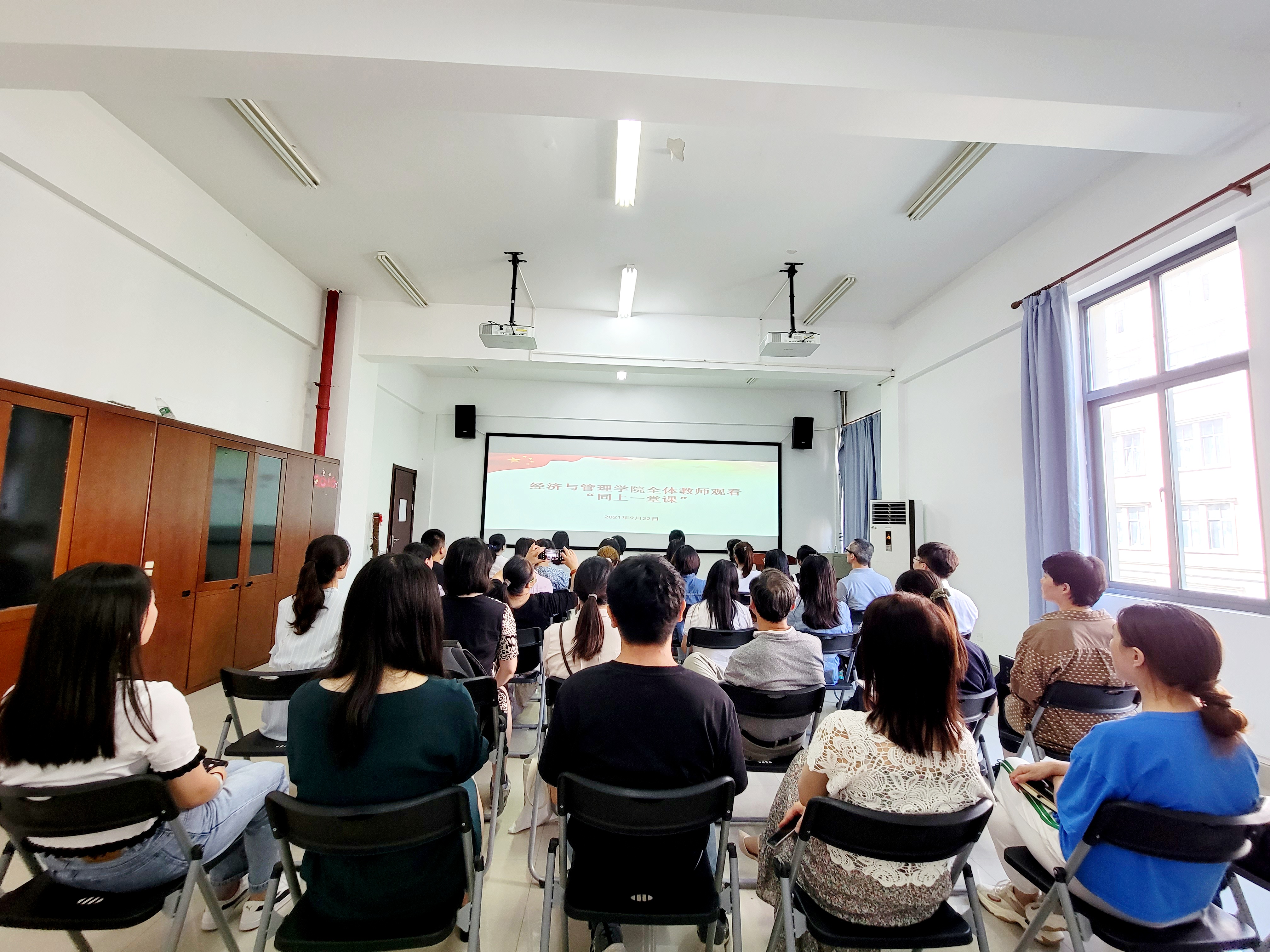 2021年9月22日中午12点,经济与管理学院全体教职工在3号楼202室观看上海民办高校“同上一堂课”课程,深入学习“七一勋章”获得者黄宝妹、“最美奋斗者”杨怀远两位全国著名劳模谈初心、话使命、讲担当。学院院长张炳达教授、副院长王殿安教授、范海燕教授、党总支副书记杨慧、郭骏以及学院全体党员教师共同观看了视频。