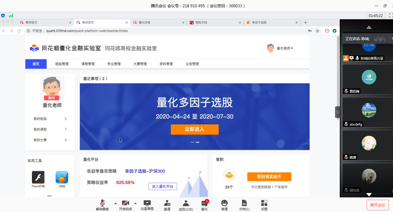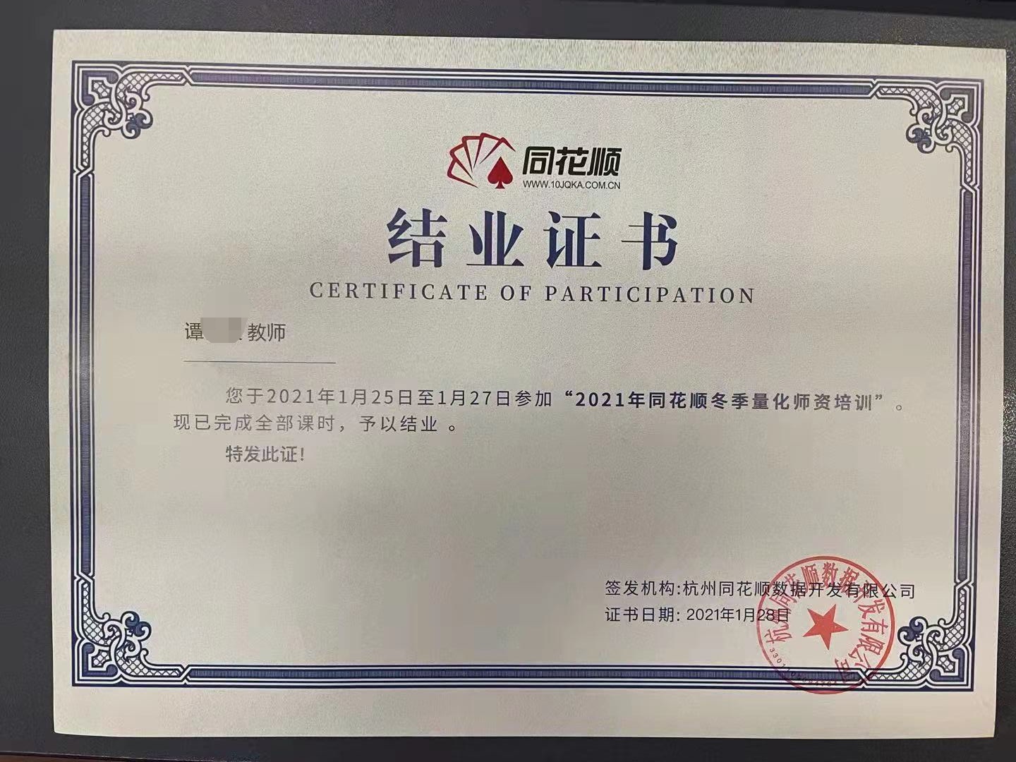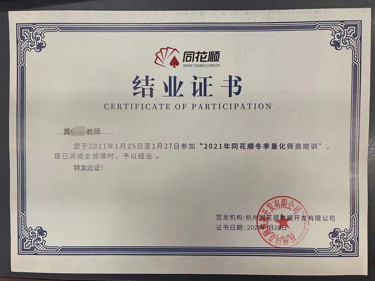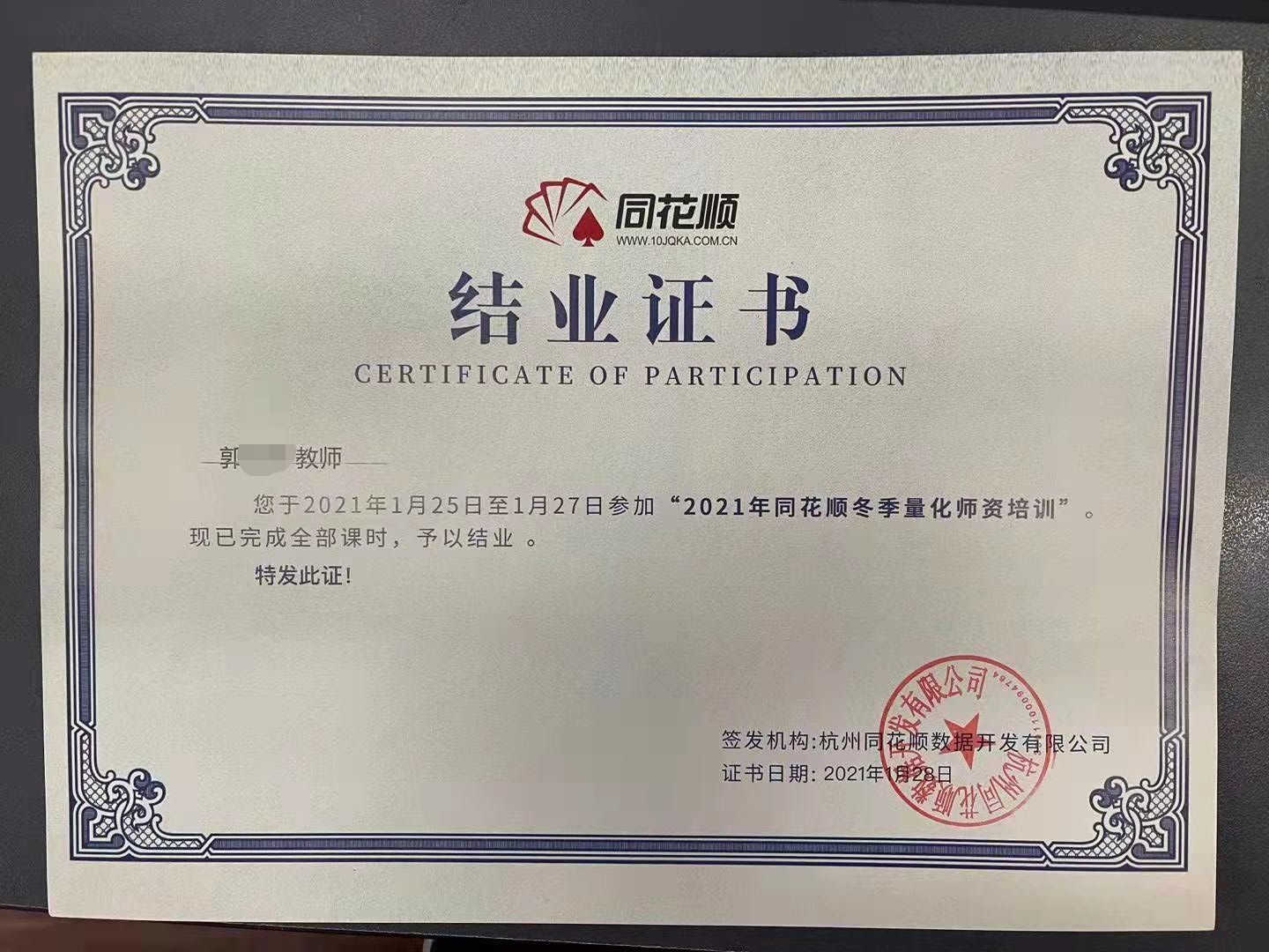 而量化金融作为金融科技应用专业、金融管理和证券实务专业建设的前沿方向,融合编程、数理统计、金融投资等专业知识,培养高质量金融人才。2021年1月25日至1月27日,同花顺高校事业部组织并开展“量化金融师资培训”线上培训活动,金融和证券专业黄老师、谭老师和郭老师参加了此次培训,并获得了结业证书。