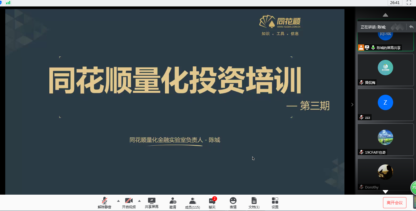 在实证研究培训中,同花顺量化投资培训班的陈诚讲师介绍了实证研究中金融数据分析处理、金融统计技术的基本技术、数据建模及数据挖掘等方面的技术。使参加培训的老师在较短的时间内增强学习和研究的能力。通过这次培训,提高了老师量化分析的能力,促进了理论和实践教学的结合。