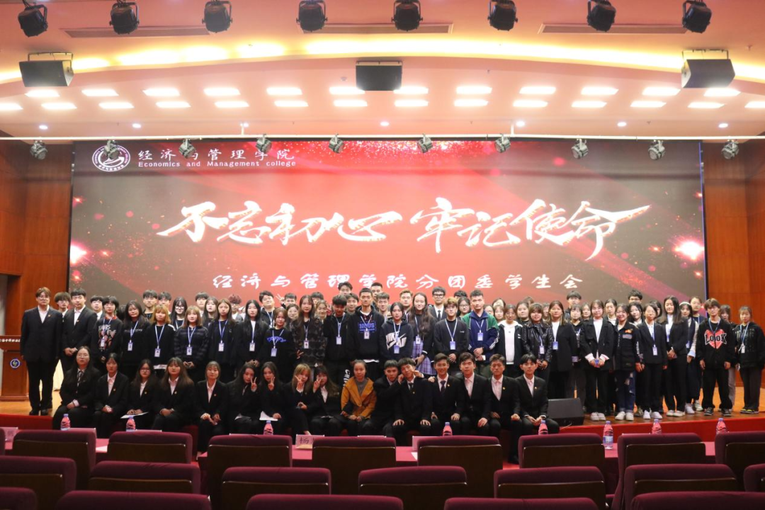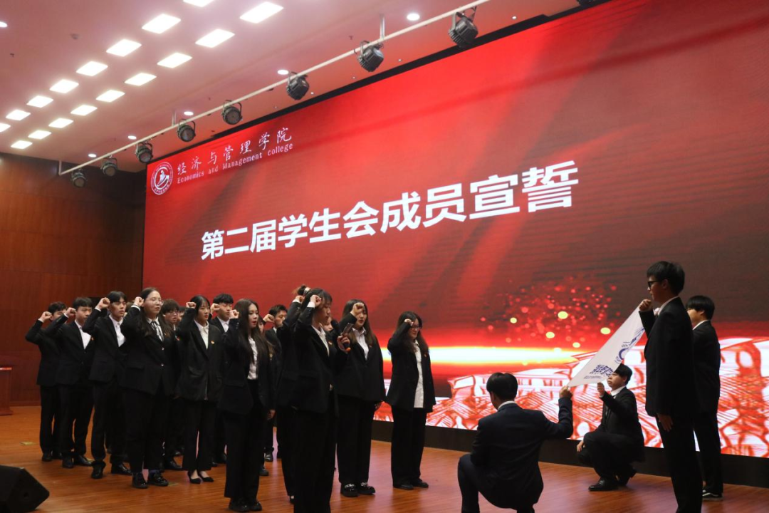 经济与管理学院19级学生会主席熊晓龙上台发言,提出学生干事要承担应有的责任与担当,加强其思想作风建设,提高学生干事的综合素质。希望大家以勤奋创新的工作履行好责任,以优异的成绩回报老师和学生的期待。