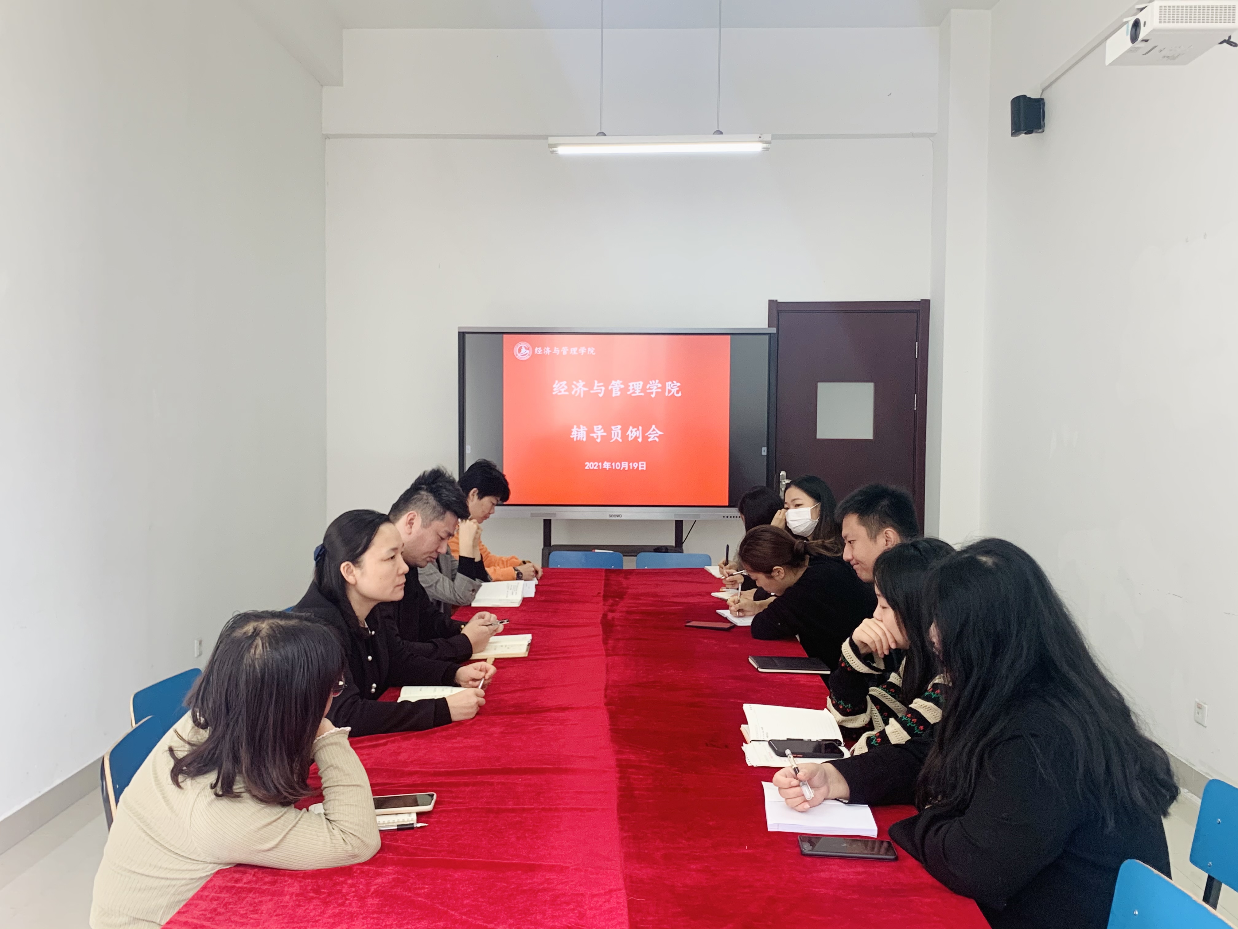 为进一步做好学生管理工作,2021年10月19日上午,经济与管理学院在教学楼4号楼203会议室召开本学期第六周辅导员工作例会,学院党总支副书记杨慧老师、郭骏老师和全体辅导员参与会议,会议由学院党总支副书记杨慧老师主持。