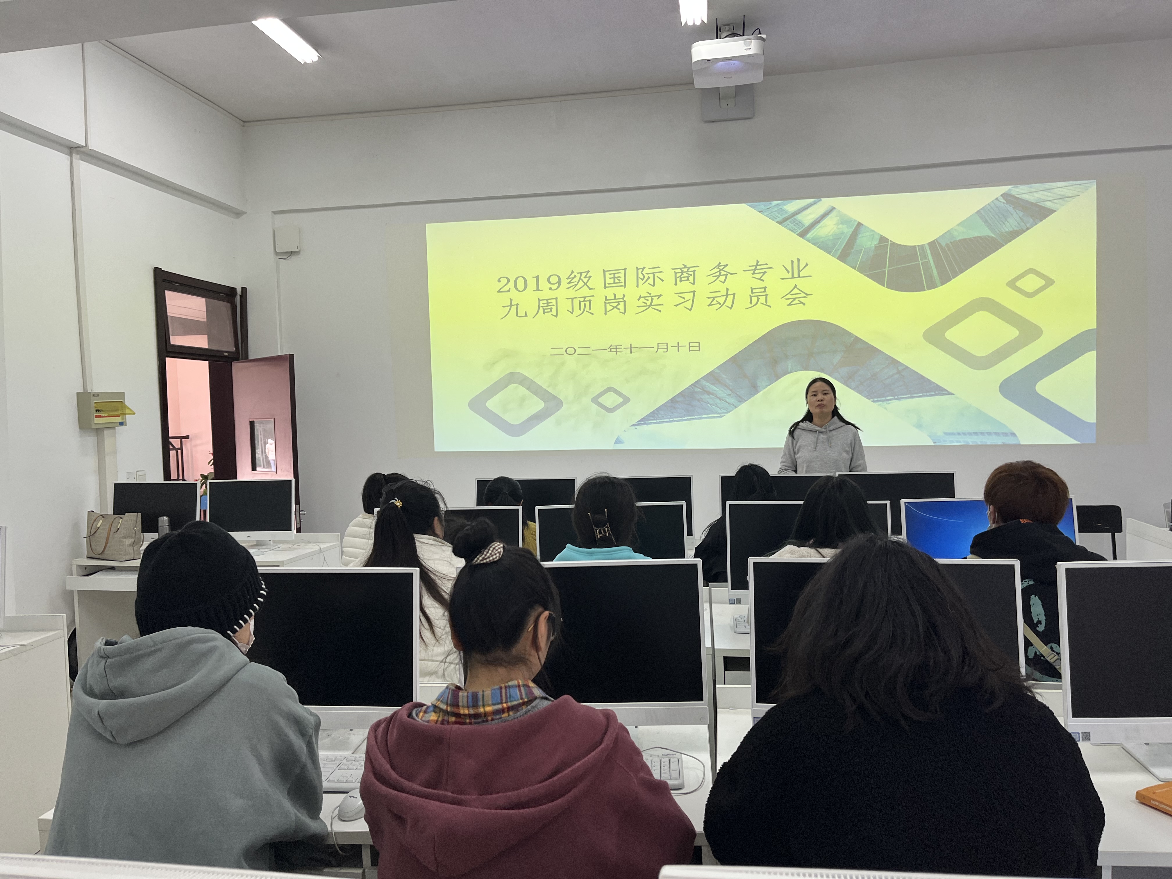 为进一步规范学生顶岗实习工作,强化管理,保证2019级国际商务专业学生实习任务的顺利完成。11月10日,在3号楼102举行了2019级国商专业实习动员大会,会议由专业主任俞春英老师主持,刘玉柱、曹珊珊、吕云飞等实习指导教师和19级国商学生参加。