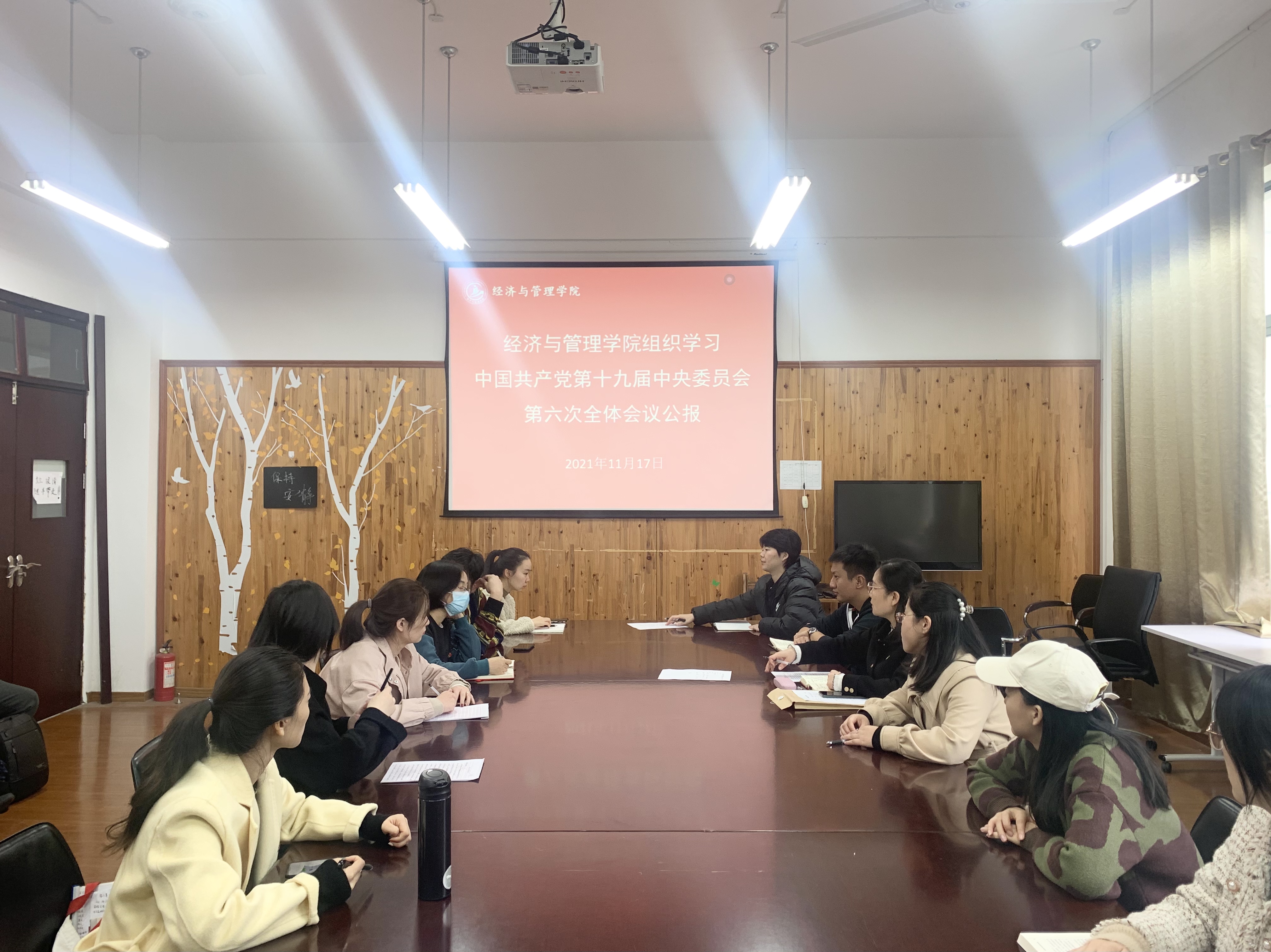 为深入学习贯彻党的十九届六中全会精神,按照学校党委的统一部署,11月17日中午,经济与管理学院组织教师党员在3号楼313会议室召开专题学习会,集中学习和讨论中国共产党第十九届中央委员会第六次全体会议公报。会议由学院党总支副书记杨慧主持。
