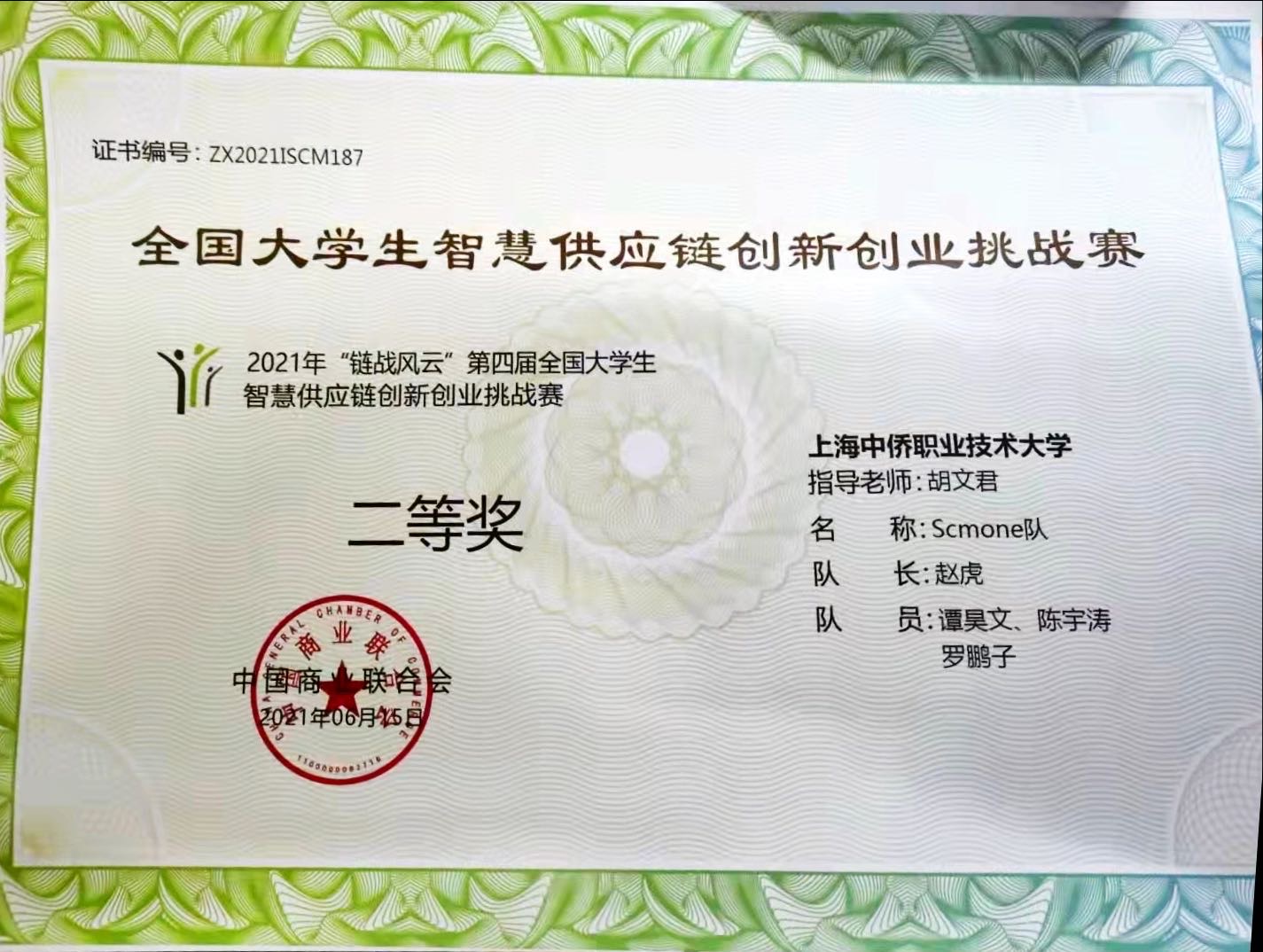 2021年6月2日,上海中侨职业技术大学参赛团队,借由全国供应链大赛ITP平台,参加2021年第四届“链战风云”全国大学生智慧供应链创新创业挑战赛初赛对抗赛。经过激烈比拼,由经济与管理学院物流管理专业赵虎、陈宇涛、罗鹏子、谭昊文四位同学组成的“scmone”团队荣获二等奖以及供应链管理中级等级证书。