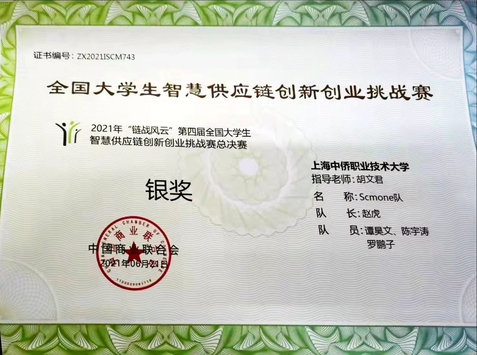 2021年6月17日,上海中侨职业技术大学参赛团队,借由全国供应链大赛ITP平台,参加2021年第四届“链战风云”全国大学生智慧供应链创新创业挑战赛决赛对抗赛。经过激烈角逐,上海中侨职业技术大学代表队喜得佳绩,最终由经济与管理学院物流管理专业赵虎、陈宇涛、罗鹏子、谭昊文四位同学组成的“scmone”团队荣获银奖。