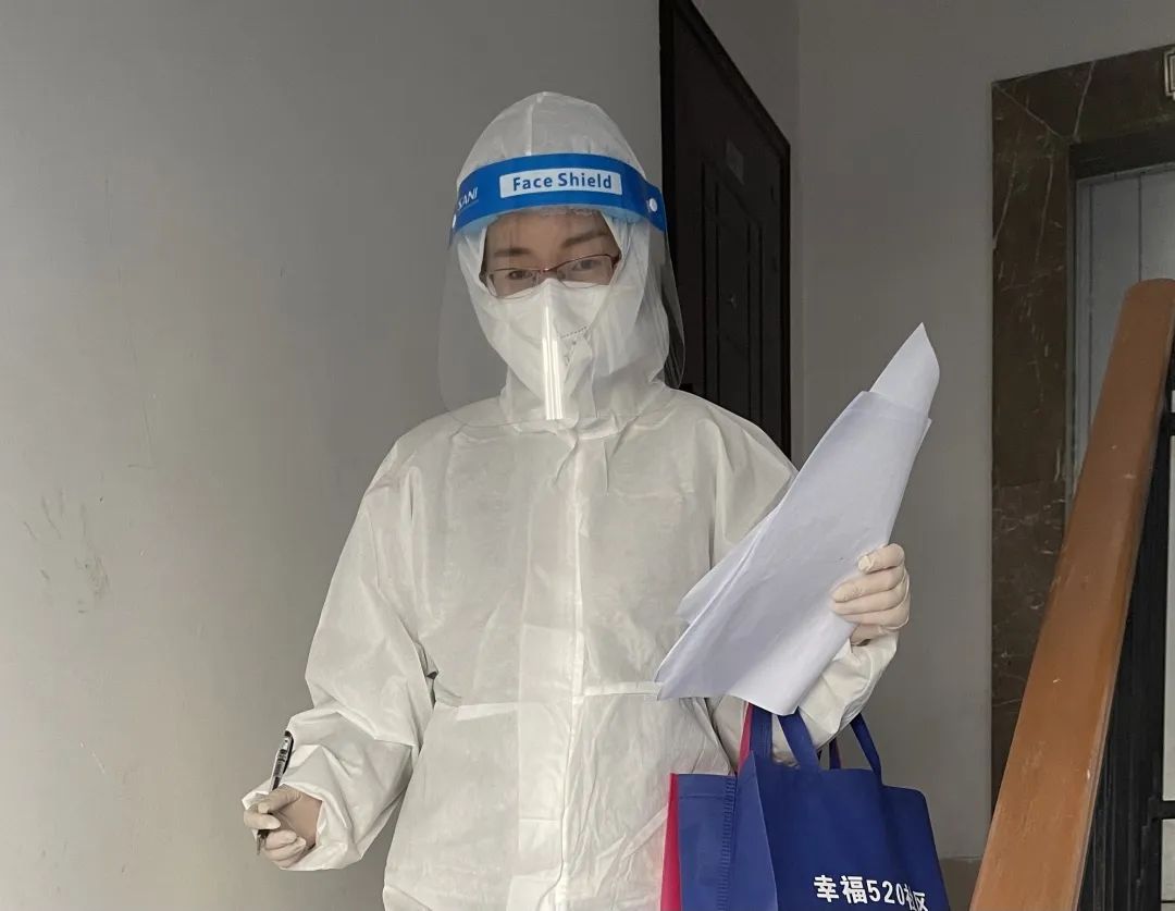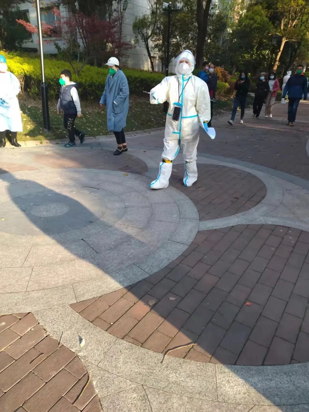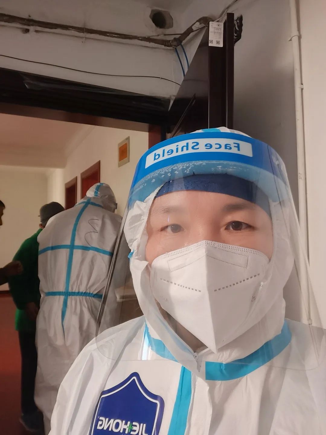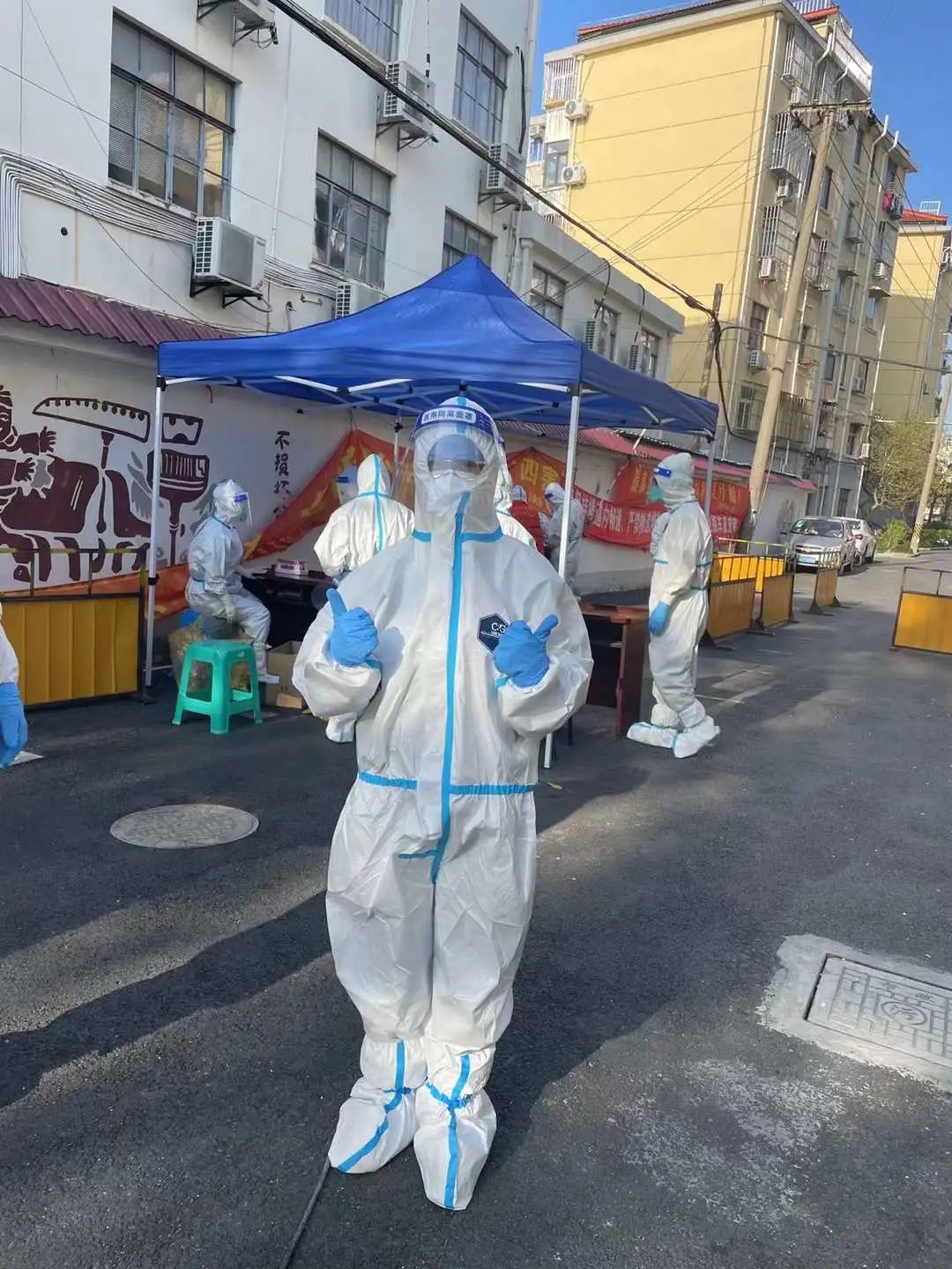 陈灵萍老师说,非常有幸参与到金山名邸小区核酸抗原志愿者服务,第一次穿上二级防护服,全副武装,这种严谨,让自己心中对奔赴在抗疫前线的“大白”们充满敬意。