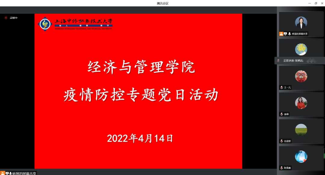 会议开始,杨慧书记传达了上周二学校书记例会主要精神。(一)学校党委要求基层党组织生活会上三个讲清楚:一是讲清楚上海疫情。上海疫情比我们预想的要复杂艰巨,防控工作一刻也不能放松;二是讲清楚学校“十四五”规划,要结合学校和二级学院实际情况落实到位;三是讲清楚在疫情防控中每个人的责任使命。(二)继续做好党员志愿者工作,加强联防联控。当前,全体教职员工要清晰的认识到上海疫情的严峻形势,在坚持做好本职工作的基础上,各位党员教师均已与本地社区党组织取得联络。1、陈灵萍老师率先在课余时间参加社区志愿者活动,随后有江芸、冯珊珊、杨慧、王彩云、滕建华、曹珊珊、顾涛等多名党员教师加入到社区志愿者活动中。2、各级党组织面对疫情,全力以赴,进入应急状态,确保了校园的安全。经管学院35名党员教师已经百分比完成社区报到,所有党员教师均完成了一天一报的任务。3、目前,社会上充斥着真假难辨的各种流言,舆论环境纷繁复杂,在这种形势下,领导干部要靠前指挥,要传播正能量,让全体师生树立战胜疫情的信心。(三)各级党组织要严格考核,时刻处于应急状态。(四)领导干部和党员教师,要发挥模范带头作用。(五)加强校园舆情舆论疏导,全院师生都要管好各自的朋友圈和社交媒体,注意传播正能量。