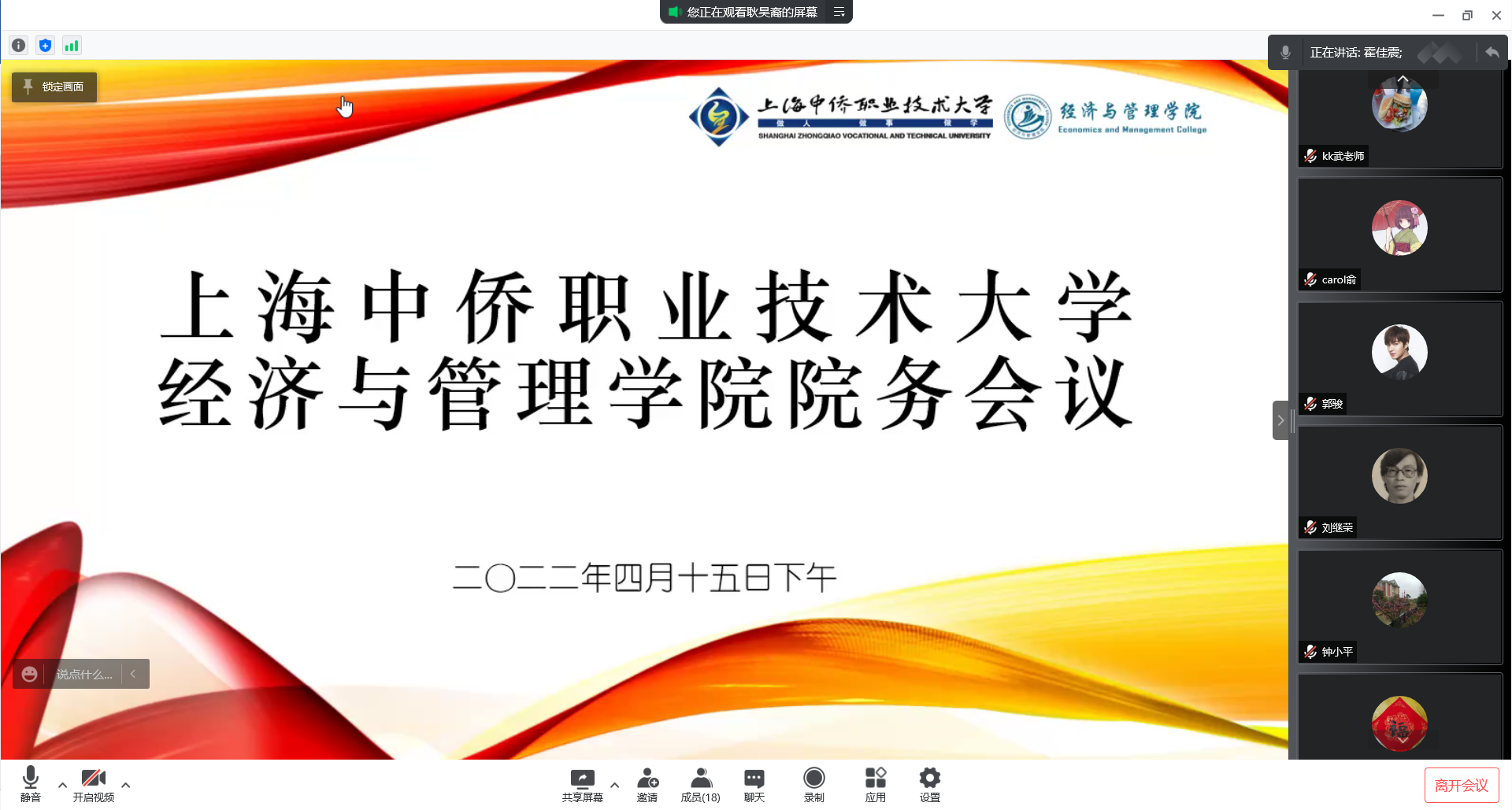 会议伊始,霍佳震校长指出,按照学校领导班子分工,由我负责联系经管学院,对此我非常高兴。今后我将和各位老师长期在一起工作了,今天在线上和大家见见面互相认识一下,也想听一听大家对学院改革、建设和发展有什么好的意见和建议,希望大家畅所欲言、各抒己见,为学院发展献计献策。