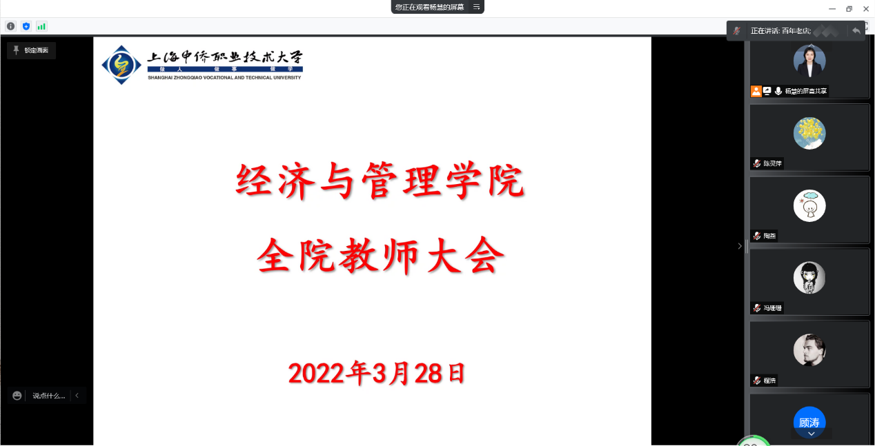 由于新冠肺炎疫情的肆虐,经管学院每周只能通过线上视频会议的方式召开全院大会。这既是一种执着,也是一种坚守,更彰显了经管学院的文化。这次疫情显示出国家是人民的坚强后盾,是城市的坚强后盾,期待我们疫后重逢的那一天。