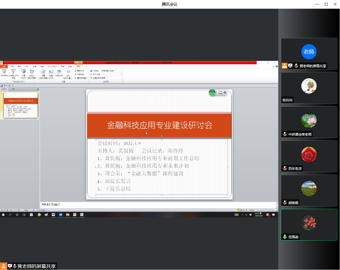 为进一步推动本科专业建设,提高教师队伍培养质量以适应专业发展,更好教导培养学生,2022年5月9日16:00到15:20,经济与管理学院金融科技应用专业在线上腾讯会议召开专业建设研讨会。本次会议由专业主任黄侃梅老师主持,经管学院王殿安副院长、范海燕副院长、金融科技应用专业及证券实务专业部分教师以及辅导员参加了此次会议。