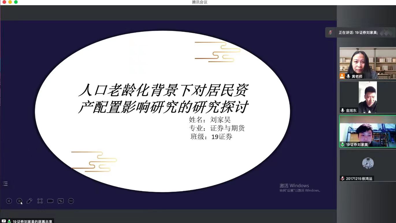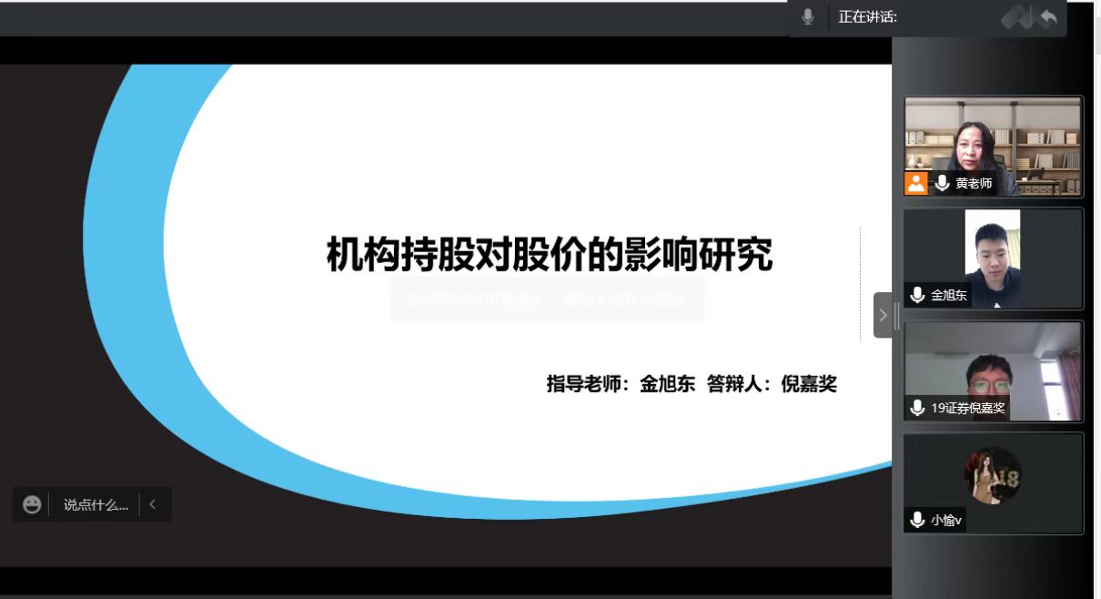 为了进一步做好新冠肺炎病毒的防控工作,在常态化疫情防控的基础上,结合我院要求,2022届证券实务专业答辩于5月13日中午12:30采取腾讯会议线上答辩的方式进行。2022届证券实务专业的所有毕业生参与了答辩,参加此次答辩会的答辩老师有黄老师和金老师。