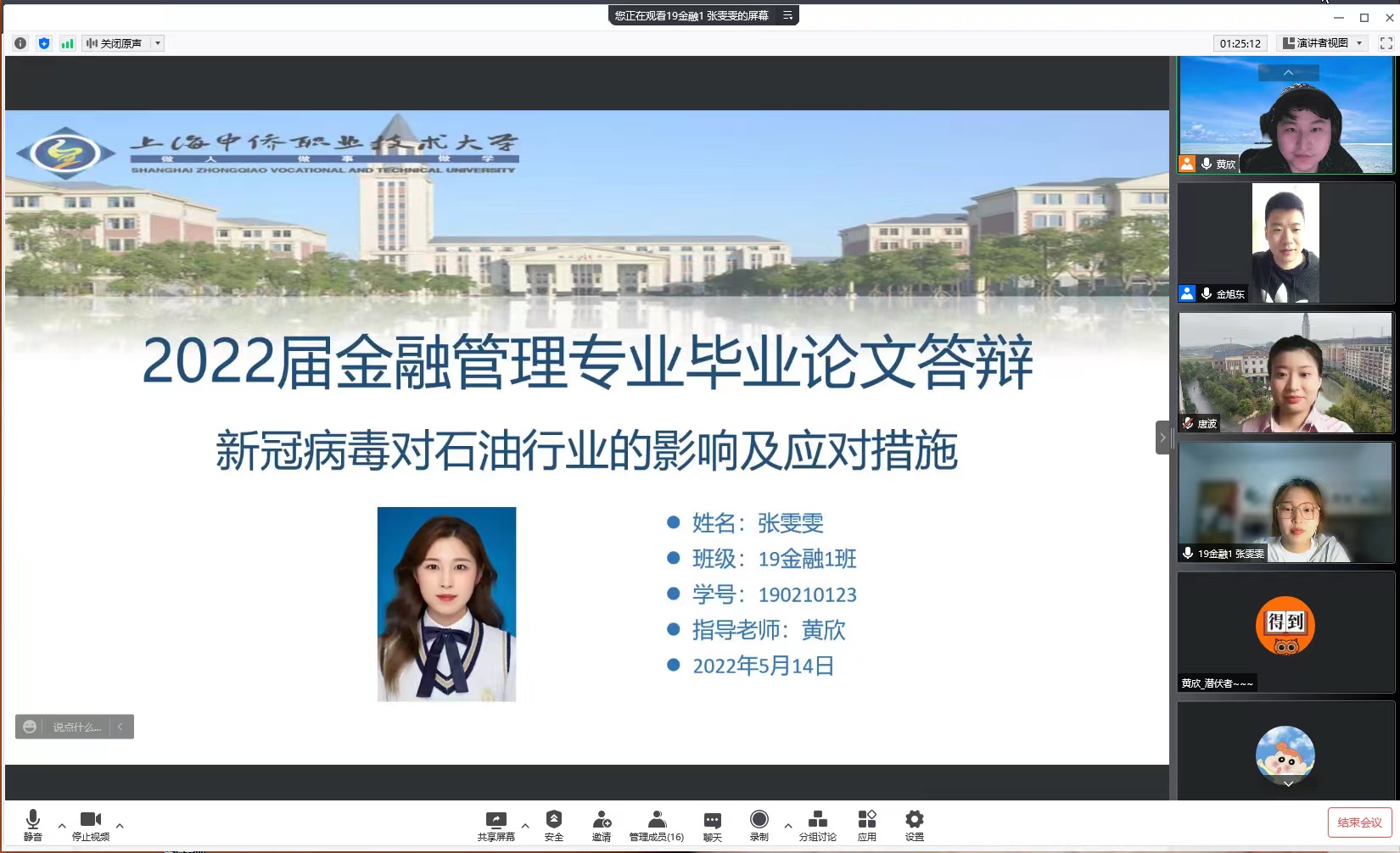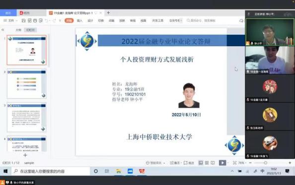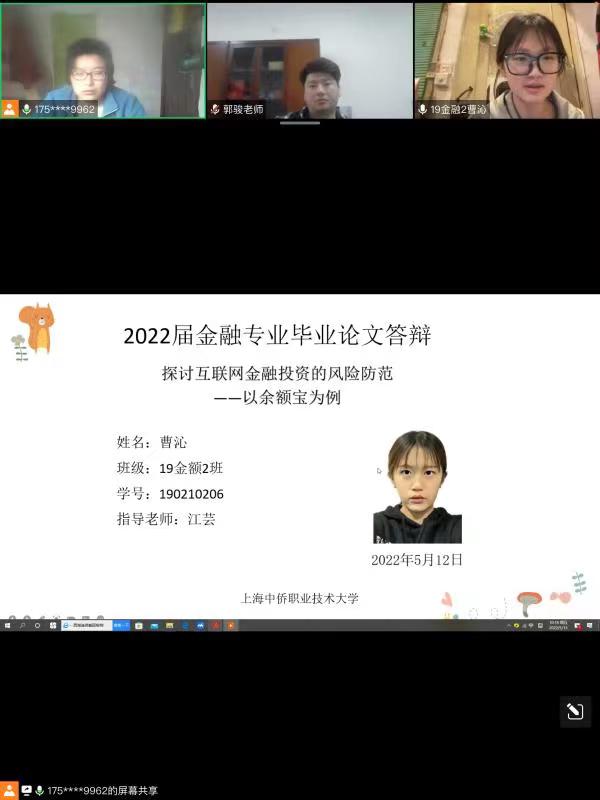 毕业论文答辩是毕业前对学生综合性实践能力和专业素质进行全方面考核的一个必要环节,为了保证学生们能顺利完成论文答辩并按时毕业,考虑到目前上海新冠疫情较为严重,2022年5月13日上午9点,经济与管理学院金融管理专业全体同学在腾讯会议上进行论文答辩。主持人:专业主任钟小平老师、黄欣老师、郭骏老师,参加会议老师:王军老师、张玉帆老师、唐波老师、金旭东老师、江芸老师。