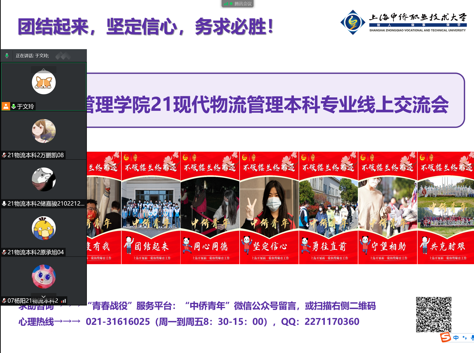 全体导师与本科学生共同线上相聚,会议以倾听和沟通为主要目的,让导师们细致了解到学生在疫情期间的生活与学习情况。面对提出的问题,导师们都逐一记录,并给予适当建议。除此之外,导师们也纷纷鼓励学生要在这段“同甘共苦”的日子里,保持乐观积极的心态,严格遵守学校的防疫要求,好好利用时间做一些有意义的事情,多读书、勤思考、注意休息、坚持锻炼身体。