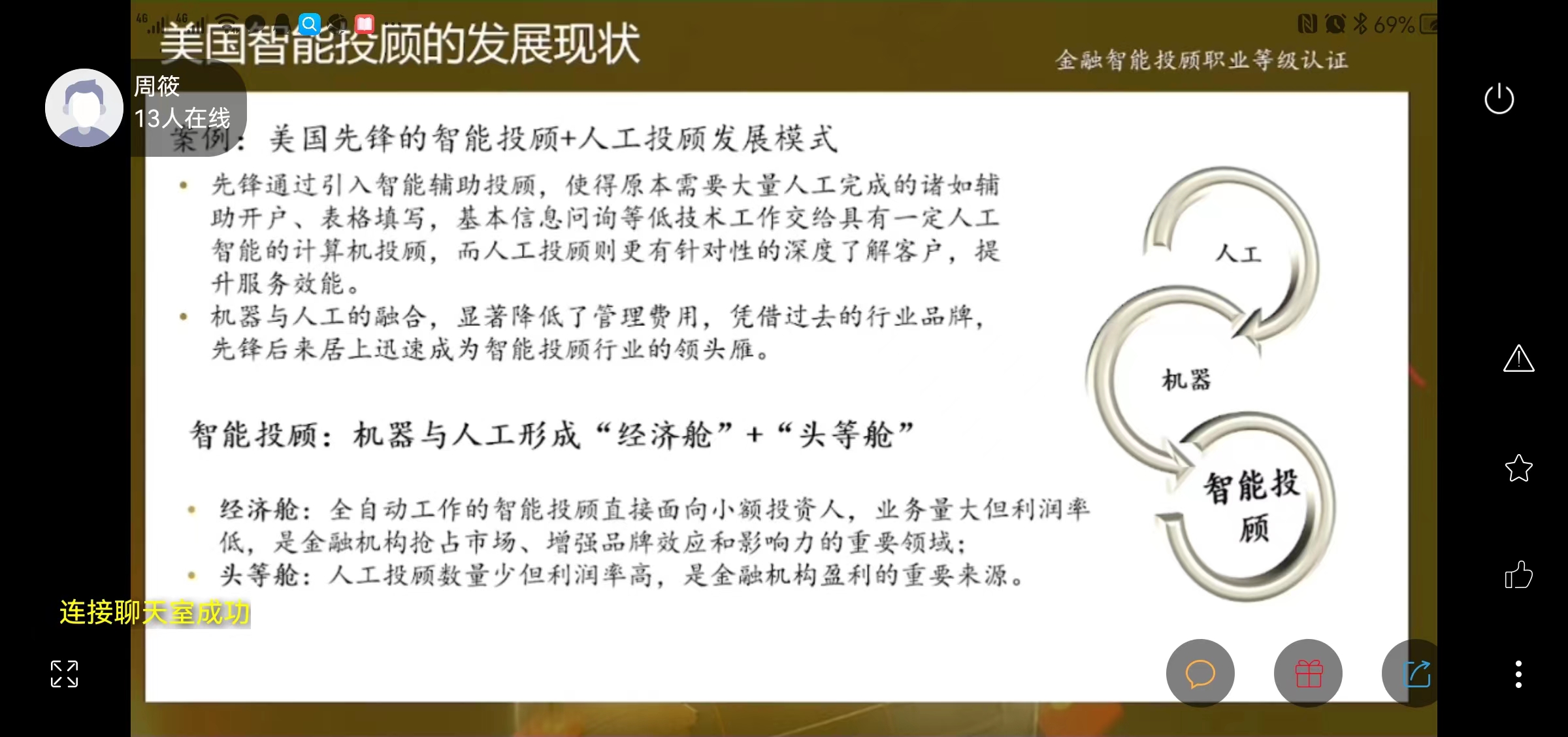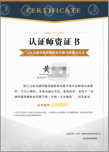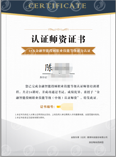 为贯彻落实《国家职业教育改革实施方案》和《关于在院校实施“学历证书+若干职业技能等级证书”制度试点方案》的有关精神,尽快对接科技发展趋势和市场需求,2022年5月,金融、证券专业教师以及一部分辅导员教师共计14人参加了由金智东博(北京)教育科技股份有限公司组织的“金融智能投顾职业技能培训”线上培训活动,并获得了“1+X”金融智能投顾职业技能登记能力认证师资证书。