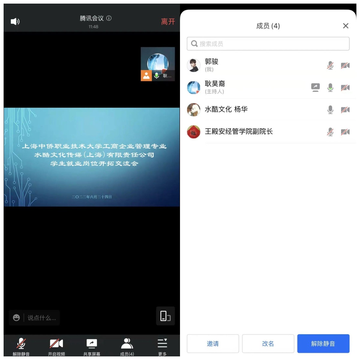 为深入贯彻落实党中央、国务院关于高校毕业生就业工作的决策部署和学校2022年“访企拓岗促就业”专项行动计划,2022年6月24日,经济与管理学院党总支副书记郭骏老师,教学副院长王殿安教授,工商企业管理专业主任刘继荣老师,专业教师耿昊裔老师共同参与座谈会,线上拜访了校友创业企业水酷文化传媒(上海)有限责任公司董事长杨华先生。