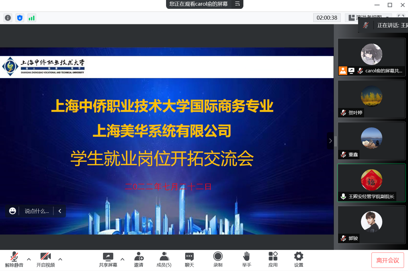 郭骏副书记感谢美华与我院国际商务专业长期以来保持的友好合作,也期待之后与美华之间更深一步的合作。期待疫情好转之后,线下可以有机会实地前往美华公司进行交流参观,期待校企之间更密切的合作。