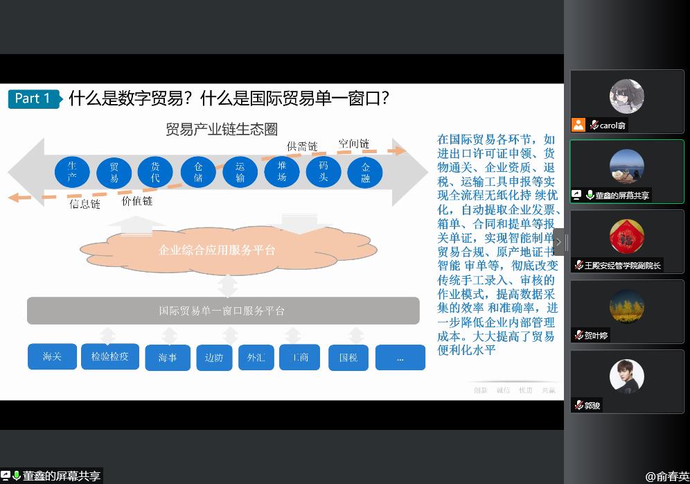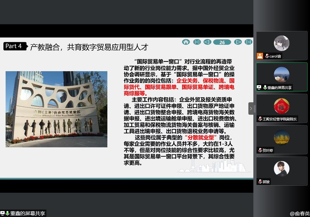 上海美华系统有限公司的董鑫经理首先从美华公司的角度对外贸人才就业情况进行介绍,尤其针对国际商务专业的现状,着重介绍了数字贸易、国际贸易单一窗口等国际商务前沿的就业趋势,从国际商务单一窗口的功能及各个环节一一介绍就业岗位。他提到,国际贸易单一窗口对行业流程的再造带动了新的行业岗位能力需求,并就国际贸易单一窗口的操作业务岗位的就业要求做了简单介绍。美华多年来面向院校提供校企服务,产教融合,共育数字贸易应用型人才。