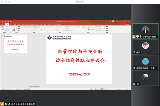 为贯彻落实党中央“六稳六保”和《教育部办公厅关于开展全国高校书记校长访企拓岗促就业专项行动的通知》精神,根据学校《2022年“访企拓岗促就业”专项行动》的统一部署和安排,我院于2022年6月27日,举办了“访企拓岗促就业”专项座谈会暨线上会并取得阶段性成效。此次参与线上会议的有经济与管理学院党总支书记杨慧老师,教学副院长范海燕教授,金融服务与管理专业主任钟小平老师,金融服务与管理教师唐波,以及企业代表平安普惠公司人力资源部吴莉女士,助推学生高质量就业,“点亮”就业潮。