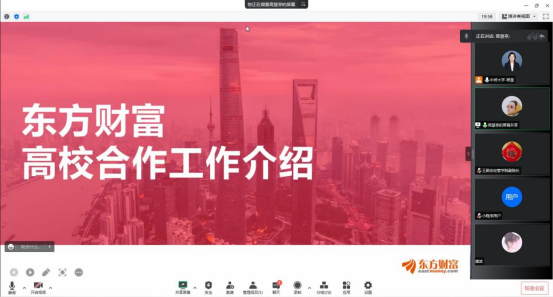 2022年8月19日,经济与管理学院与东方财富信息股份有限公司(后简称“东方财富”)的校企合作洽谈会在腾讯会议上顺利召开。参与本次洽谈会的企业方领导有上海区副总经理高慧亭女士,校方出席人员有经济与管理学院党总支书记杨慧老师,教学院长王殿安教授,金融服务与管理专业主任钟小平老师以及金融服务与管理专业教师唐波,双方关于企业用人需求、人才培养、产教融合等校企合作方面工作展开深入交流。