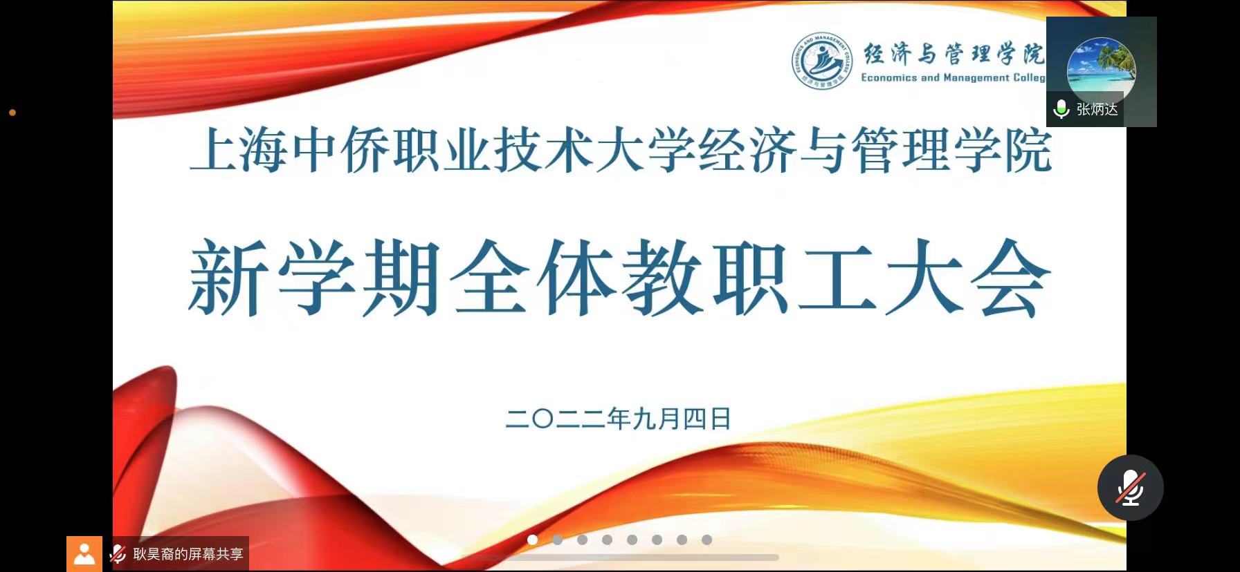 2022年9月4日,经管学院张院长、院党总支书记杨慧、副院长王殿安、副院长范海燕、院党总支副书记郭骏、学院全体教职员工通过腾讯会议召开全院大会。会议由张院长主持。