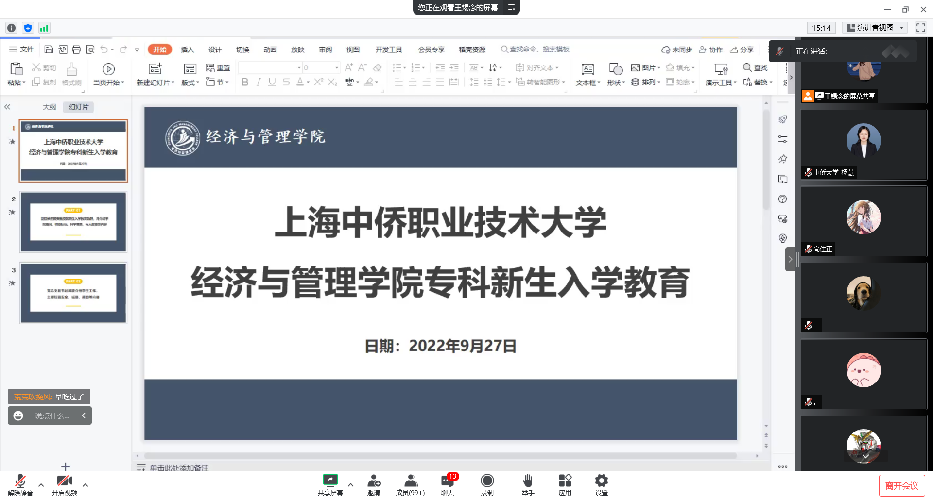 9月27日,经济与管理学院2022级专科新生入学教育会议在腾讯会议正式召开。本次见面会由学院党总支书记杨慧老师主持,出席本次见面会的有学院副院长王殿安教授、院党总支副书记郭骏老师和各专业主任。辅导员王锡念、张玉帆以及2022级全体专科新生参加了本次会议。