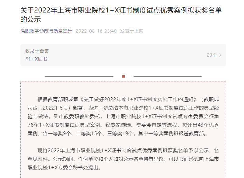 此次,上海市职业院校1+X证书制度试点专家委员会征集78个1+X证书制度试点典型案例。经专家遴选、专委会审定等流程,评选出43个优秀案例,含一等奖9个、二等奖15个、三等奖19个。