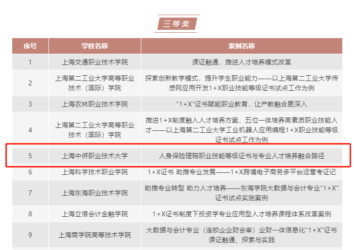 根据教育部职成司《关于做好2022年度1+X证书制度实施工作的通知》(教职成司函〔2022〕5号)部署,上海市教委职教处向全市中高职院校征集了1+X证书制度试点案例。且于2022年8月16日至20日,上海市职业院校1+X专委会对2022年上海市职业院校1+X证书制度试点优秀案例获奖名单进行了公示,我校经济与管理学院金融服务与管理专业组织提交的《人身保险理赔职业技能等级证书与专业人才培养融合路径》获三等奖。