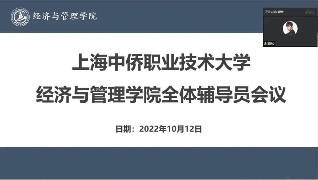 为落实学校各项工作安排,2022年10月12日18:45,经济与管理学院在腾讯会议召开全体辅导员例会,学院党总支书记杨慧、党总支副书记郭骏以及全体辅导员参会,会议由郭骏书记主持。
