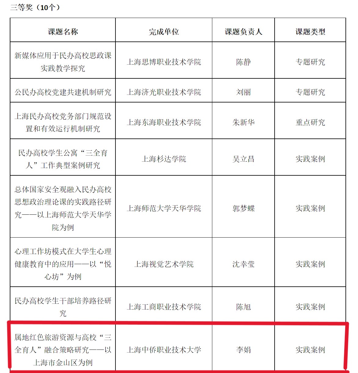 经有关领导和专家进行初评、复评和终评,全市共评选出优秀课题成果20个,我院该课题荣获研究课题成果三等奖。我院将会在高校党建与思政工作方面进一步加强交流研讨,提升队伍素质,注重成果转化,力争形成更加科学、更加有效、更高质量的研究成果,不断提高党建和思政研究工作的质量,为推动上海民办高等教育事业深化发展作出新的贡献。