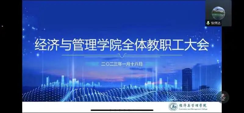 2023年1月18日,经管学院全体教师通过腾讯会议召开全体会议。经管学院张院长、院党总支书记杨慧、副院长王殿安、副院长范海燕、院党总支副书记郭骏、经管学院全体教职员工召开全院大会。会议由张院长主持。