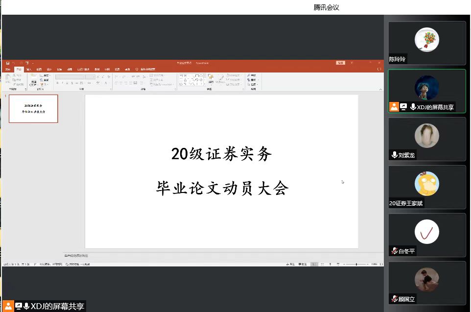 毕业设计(论文)工作是完成人才培养的一个重要的综合性实践教学环节,是毕业前对学生进行全面考核的必要环节之一。为加强对毕业设计(论文)工作的管理,进一步提高毕业设计(论文)工作的质量,使毕业设计(论文)工作顺利进行,证券实务专业于3月6日晚上9点半开展2020级证券实务专业毕业论文(设计)动员大会。此次会议由证券实务专业金老师主持,证券实务专业胡老师、辅导员陈老师和2020级证券实务专业学生参加了此次会议。
