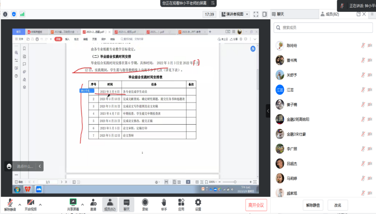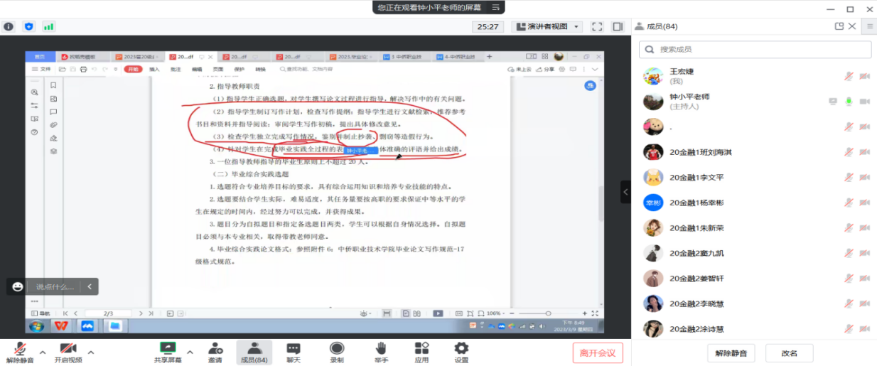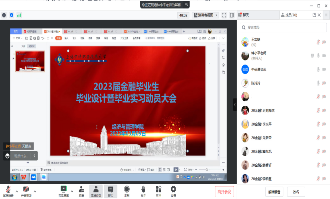 为了让同学们能够明白毕业实习的重要性并且全身心地投入工作中,进一步理解自己所学的专业,金融服务与管理专业于2023年3月9日晚上20:30时以腾讯会议召开2023届毕业生实习动员会。会议由专业主任钟小平老师主持,陈锐、谭会荣、江芸、黄欣、唐波、金旭东、胡俊霞、王军、陈玲玲等十位指导老师,以及全体20级金融服务与管理专业116名学生参加了此次会议。