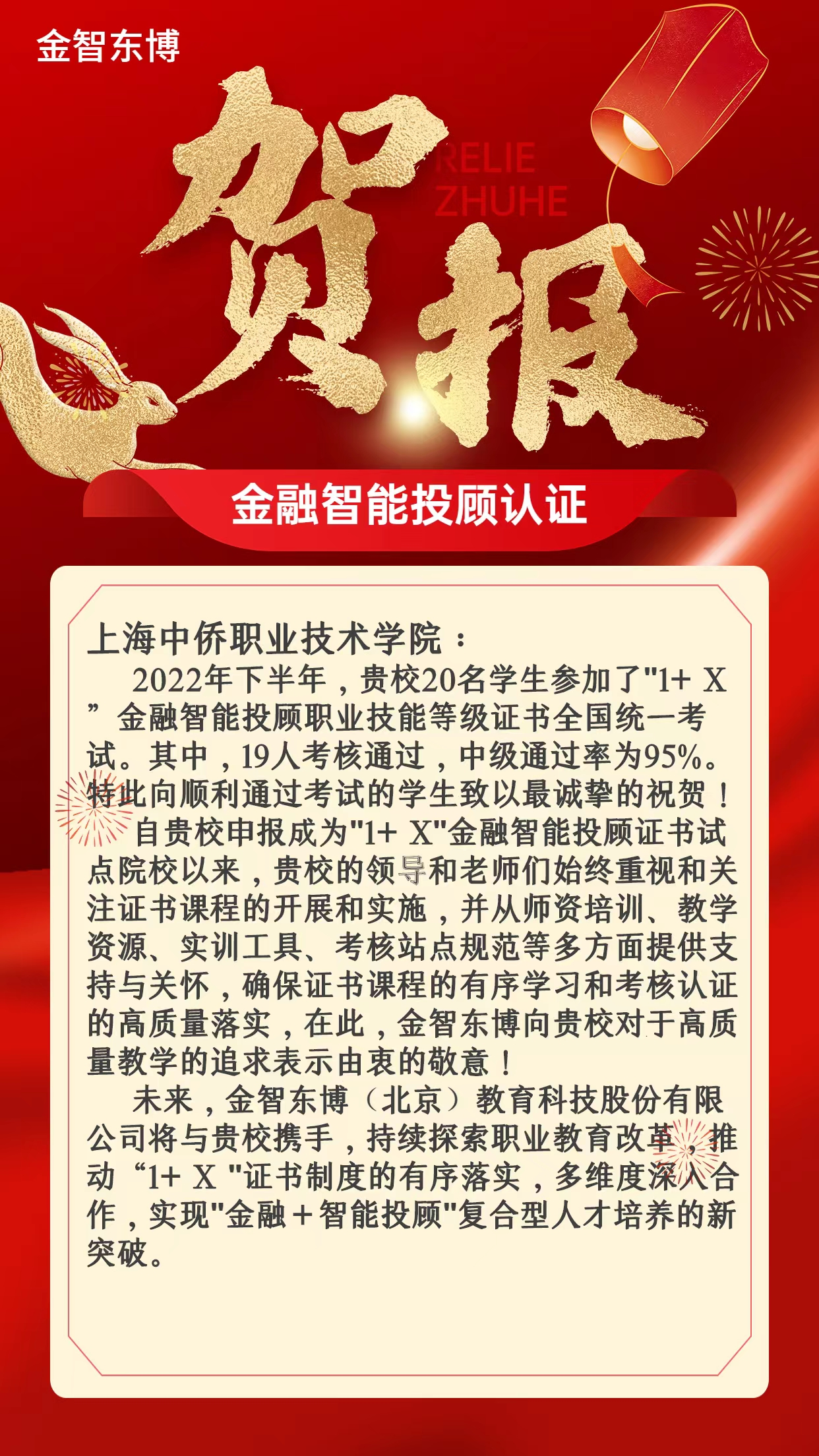 金融智能投顾1+X考证项目是由我校金融科技应用本科专业发起,来自金融科技应用专业、证券实务专业、金融管理与服务专业、大数据与会计专业合作参与,我校经管学院学生是首次参加1+X金融智能投顾职业技能等级证书(中级)考试就取得了优秀的成绩,是我校深化职教改革,实施岗、课、赛、证融通以来的阶段性成果,彰显了我校经管学院人才培养的质量和水平。