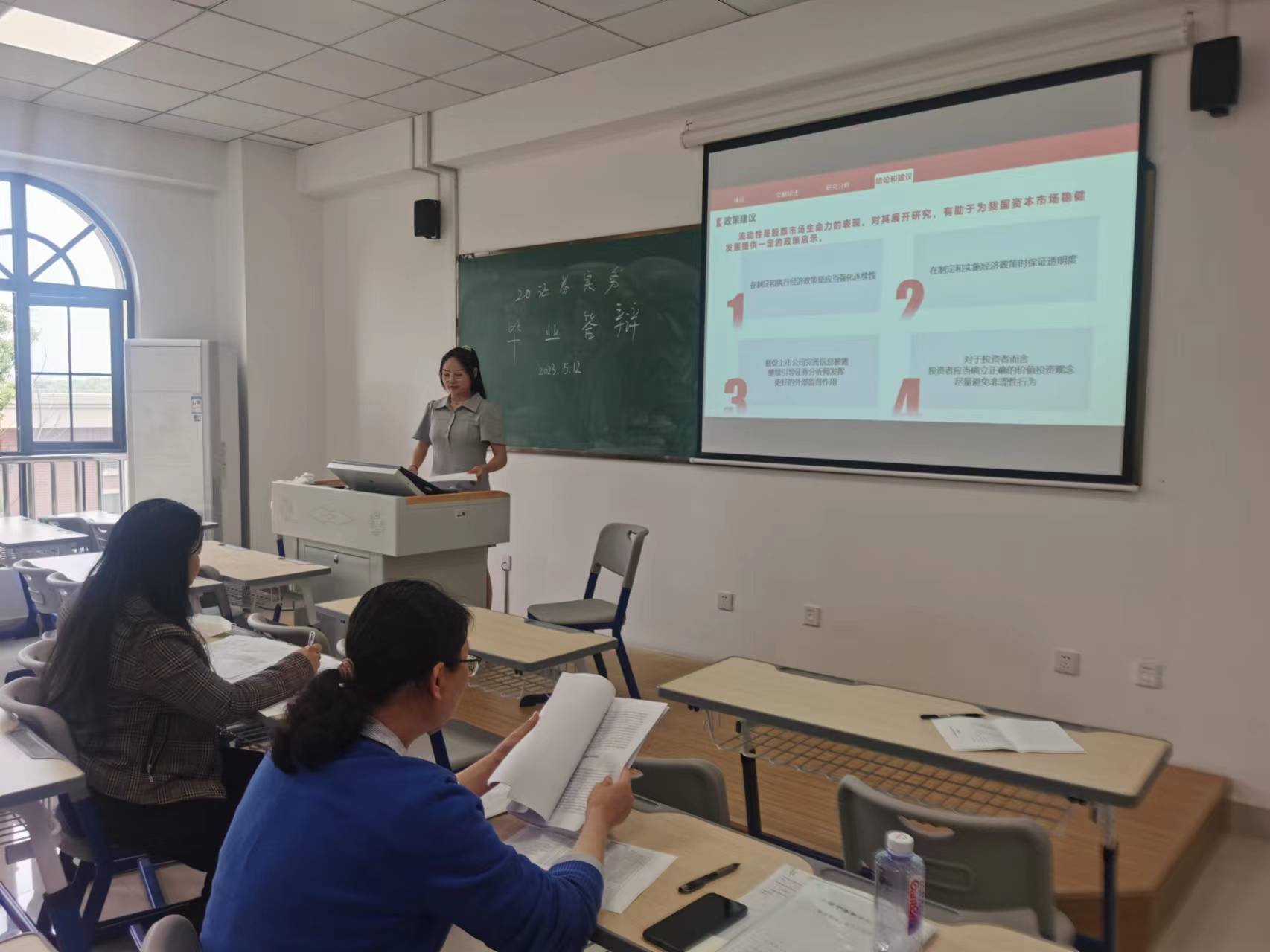 2023年5月12日,证券实务专业2023届毕业论文答辩在42号楼218教室举行,这是新冠疫情以来,第一次组织线下毕业答辩。作为毕业生毕业前的最后考验,本次答辩受到了20级证券实务专业全体师生的高度重视。黄侃老师、胡俊霞老师作为评委专家参与了本次答辩。