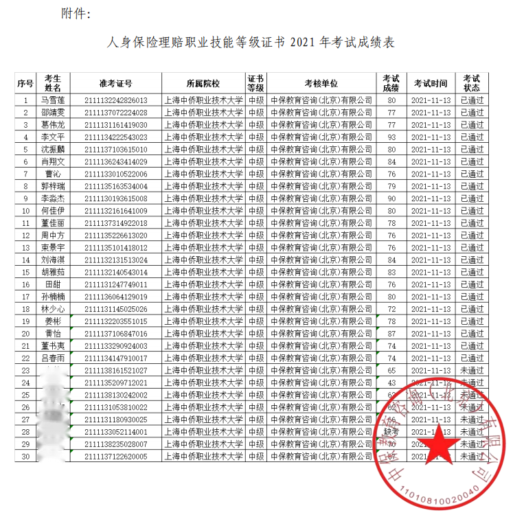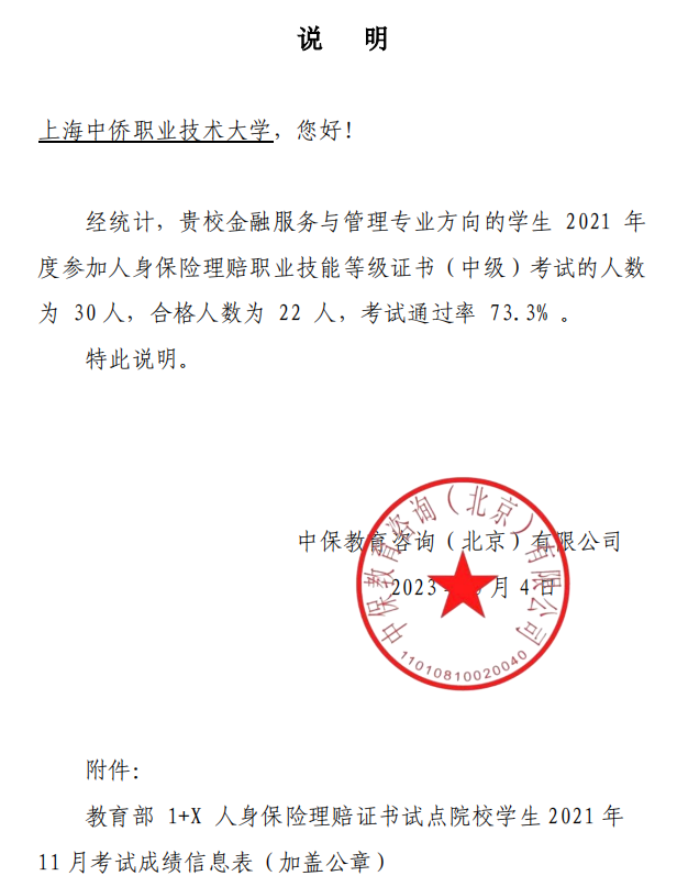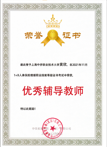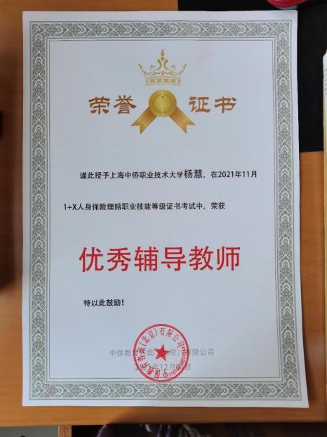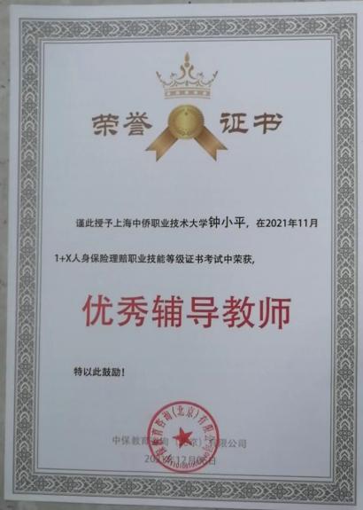 中保教育咨询(北京)有限公司延期(前期疫情)举办了人身保险理赔职业技能等级证书2021-2022年优秀试点院校及优秀教师表彰大会,我校荣获2021年1+X人身保险理赔职业技能等级证书(中级)考试“优秀组织奖”,钟小平、杨慧、黄欣三位老师分别荣获2021年1+X人身保险理赔职业技能等级证书考试“优秀辅导教师”,有22名同学经考试荣获1+X人身保险理赔职业技能等级证书(中级),合格率为73.3%。