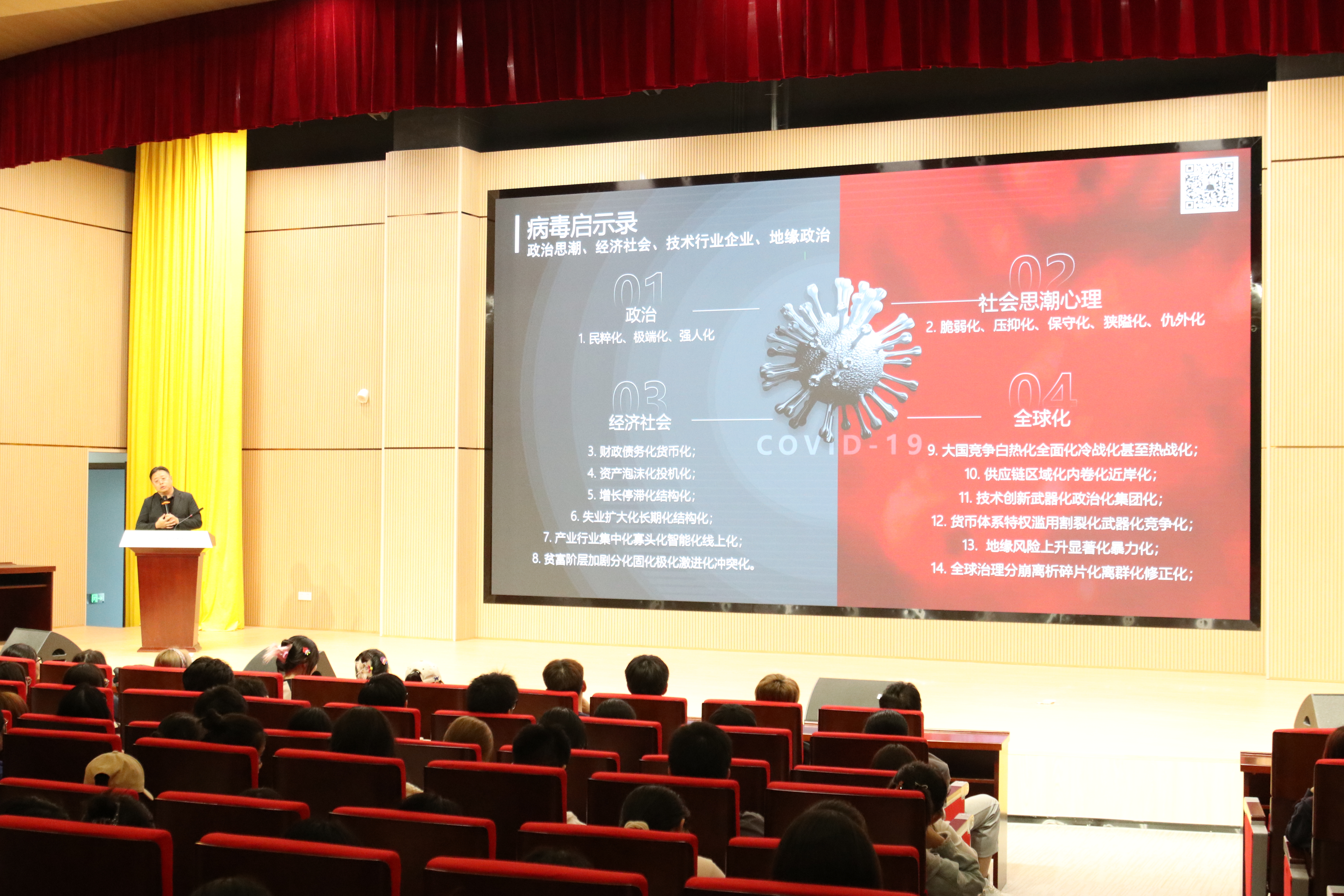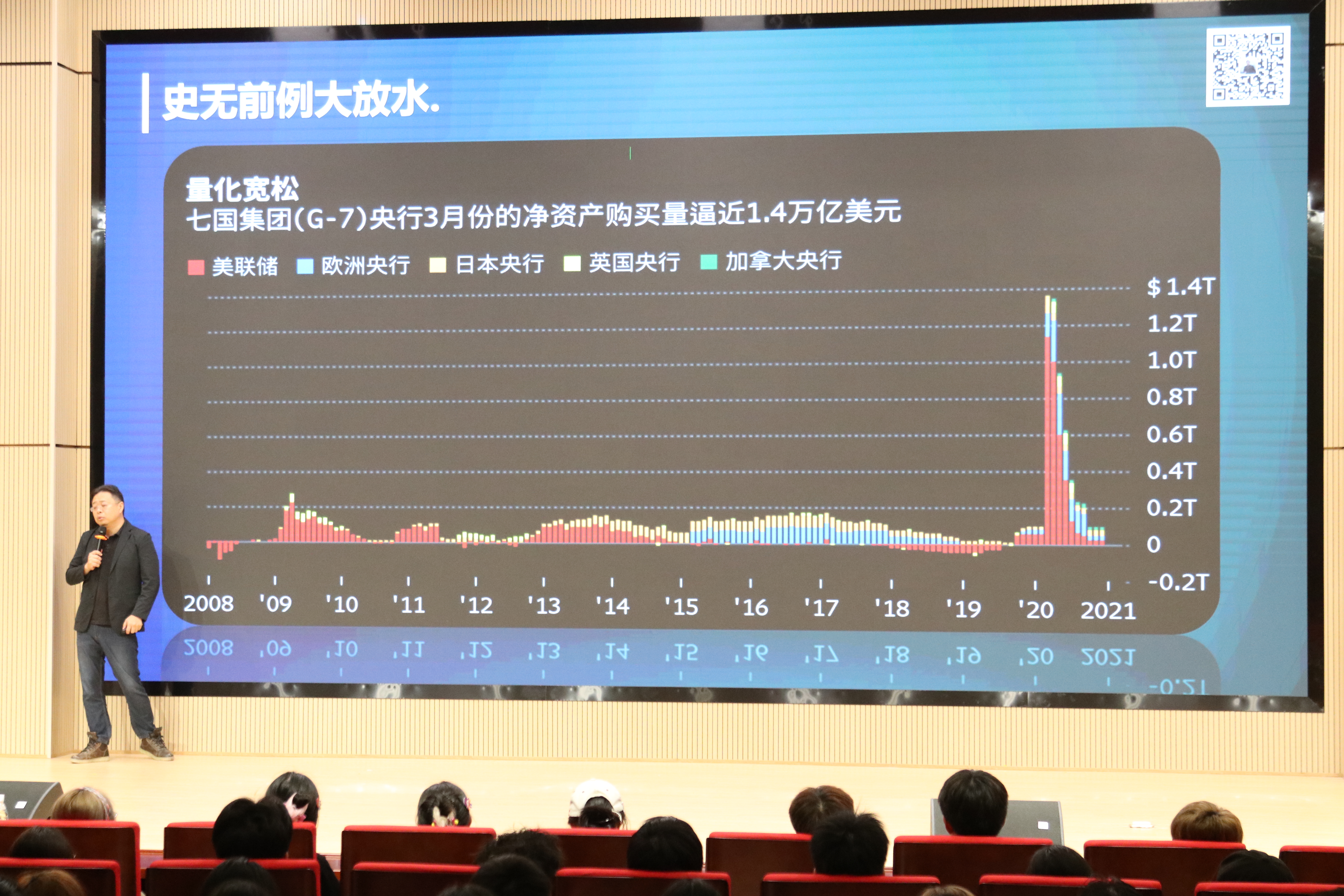 随后由邵宇博士进行专题讲座。邵宇博士首先从当下新冠疫情角度出发,将其与历史上黑死病与天花造成的巨大影响进行类比,来说明病毒会在政治思潮、经济社会、技术行业企业、地缘政治等方面影响世界。具体而言,新冠疫情改变世界,带来百年未有之大变局。疫情带来的影响还有全球GDP增速减缓、经济增长停滞化结构化,大批企业经营困难甚至倒闭,社会失业扩大化长期化等。随着货币的大规模发行,资产泡沫化投机化愈发显著,央行采取史无前例的量化宽松政策,投放出的流动性或导致资产的重新估值。邵宇博士将此次疫情期间G7国的量化宽松政策与历史上多次经济危机中欧美国家的量化宽松政策进行比较,并分析了疫情期间不同国家一些标志性的重要政治事件,以及中国需在此次疫情中具备更加完备的应对政策与长期思想准备的必要性。在全球化方面,邵宇博士以美国总统大选、中美贸易战为切入点,分析了中美关系和中国应对策略。他认为,中美之争本质上是中国特色社会主义和以美国为代表的资本主义的体制之争,在高端制造业、供应链等领域中,中美竞争会更加白热化。邵宇博士还强调了愈发凸显的老龄化问题会给经济带来一系列危机。
