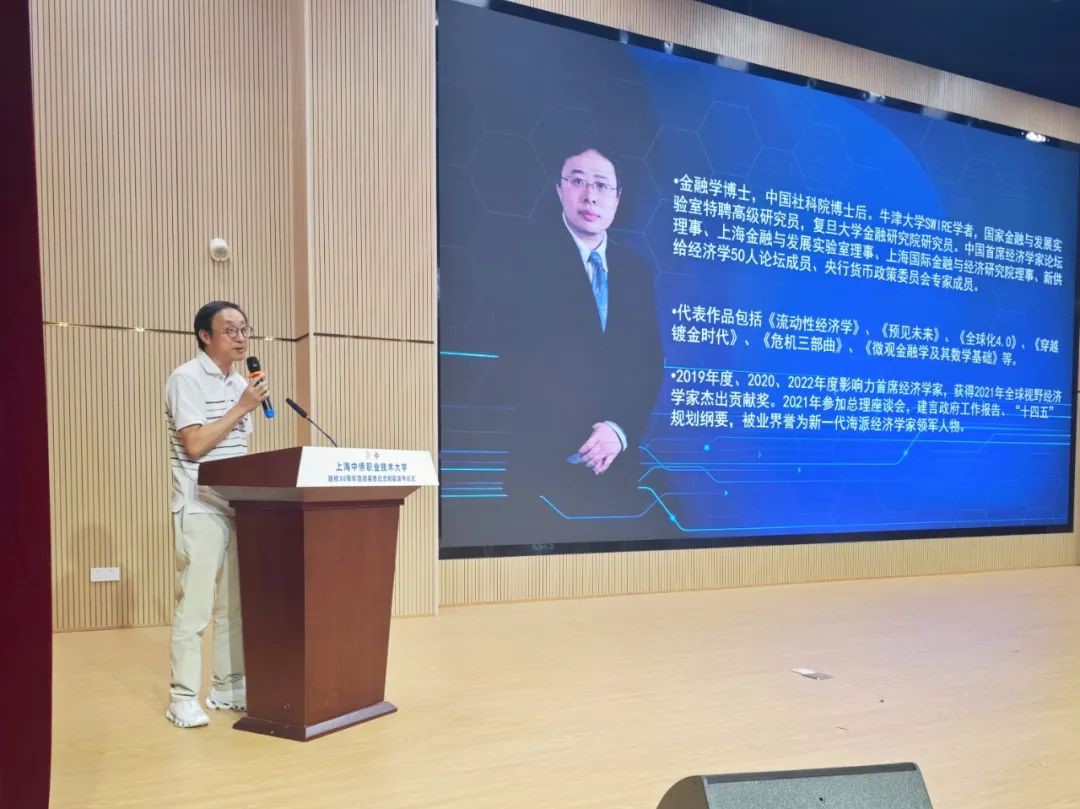 上海中侨职业技术大学经济与管理学院院长张炳达教授作为主持人首先致辞,简要介绍了金融科技应用本科专业的情况,并为大家介绍讲座嘉宾邵宇先生。邵宇先生为金融学博士,中国社科院博士后。牛津大学SWIRE学者,国家金融与发展实验室特聘高级研究员,复旦大学金融研究院研究员。中国首席经济学家论坛理事、上海金融与发展实验室理事、上海国际金融与经济研究院理事、新供给经济学50人论坛成员、央行货币政策委员会专家成员。代表作品包括《流动性经济学》、《预见未来》、《全球化4.0》、《穿越镀金时代》、《危机三部曲》、《微观金融学及其数学基础》等。2019、2020、2022年度影响力首席经济学家,获得2021年全球视野经济学家杰出贡献奖。2021年参加总理座谈会,建言政府工作报告、“十四五”规划纲要,被业界誉为新一代海派经济学家领军人物。研究领域覆盖全球宏观、中国宏观、权益债券投资策略和金融工程。