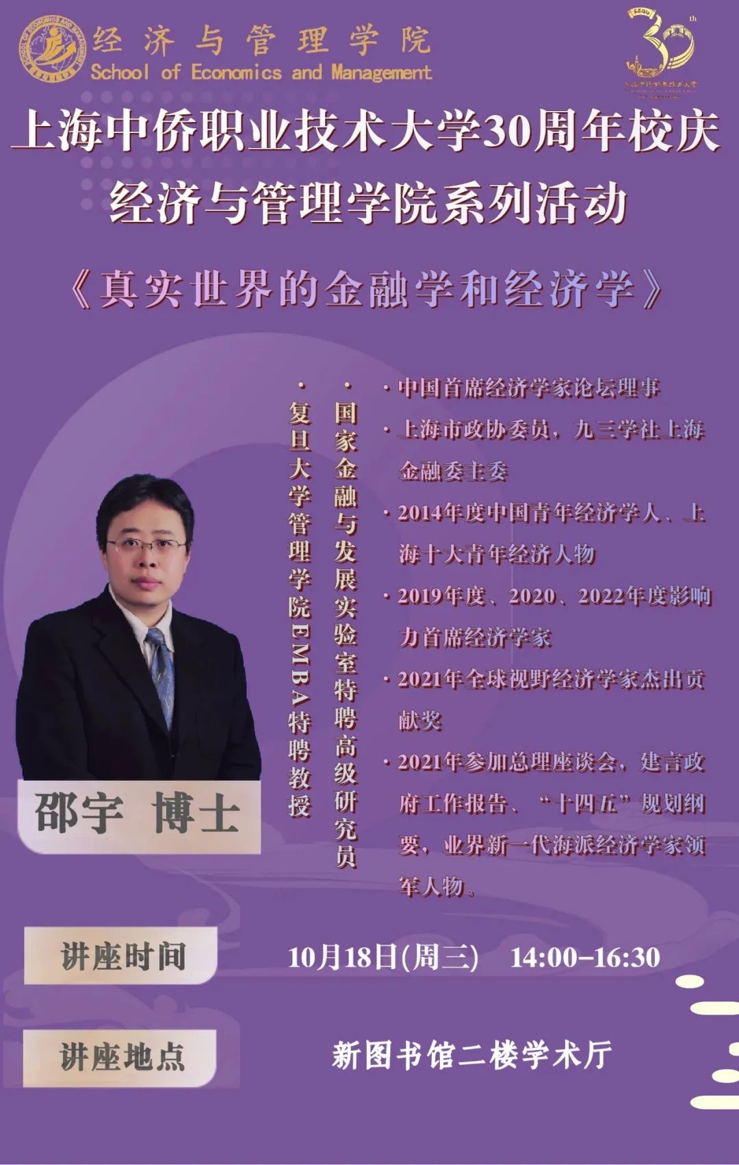 10月18日下午2点,中国首席经济学家论坛理事邵宇博士做客“上海中侨职业技术大学30周年系列讲座课堂”,带来主题为《真实世界的金融学和经济学》的精彩讲座。经管学院范海燕教授、金融科技应用专业校内专业带头人陆德明教授、金融科技应用专业主任黄侃梅副教授、专业教师黄欣、王李晴及金融科技应用专业、大数据与会计专业、现代物流管理专业等200名学生参会。